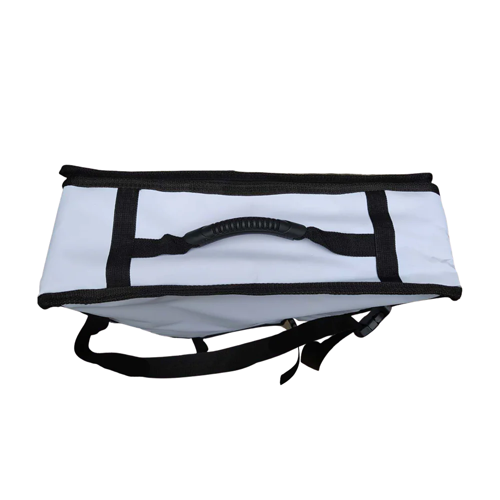 Our Scout INSULATED CATCH BAGS are custom designed to fit neatly on top of the bow canopy or tuck it underneath. The bags are attached with 2 adjustable web straps and clips with a handy robust carry handle on the top end of the bag.