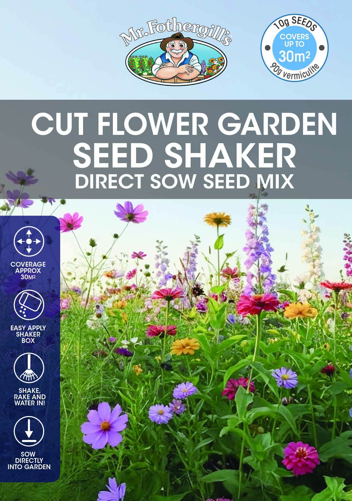 This Cut Flower Garden Seed Shaker contains 100g of Shake & Rake mix (10g seed and 90g vermiculite), enough to cover a 30m² area. The seed mix contains vermiculite, a natural mineral that ensures even seed distribution, maintains moisture levels, and supports optimal germination.