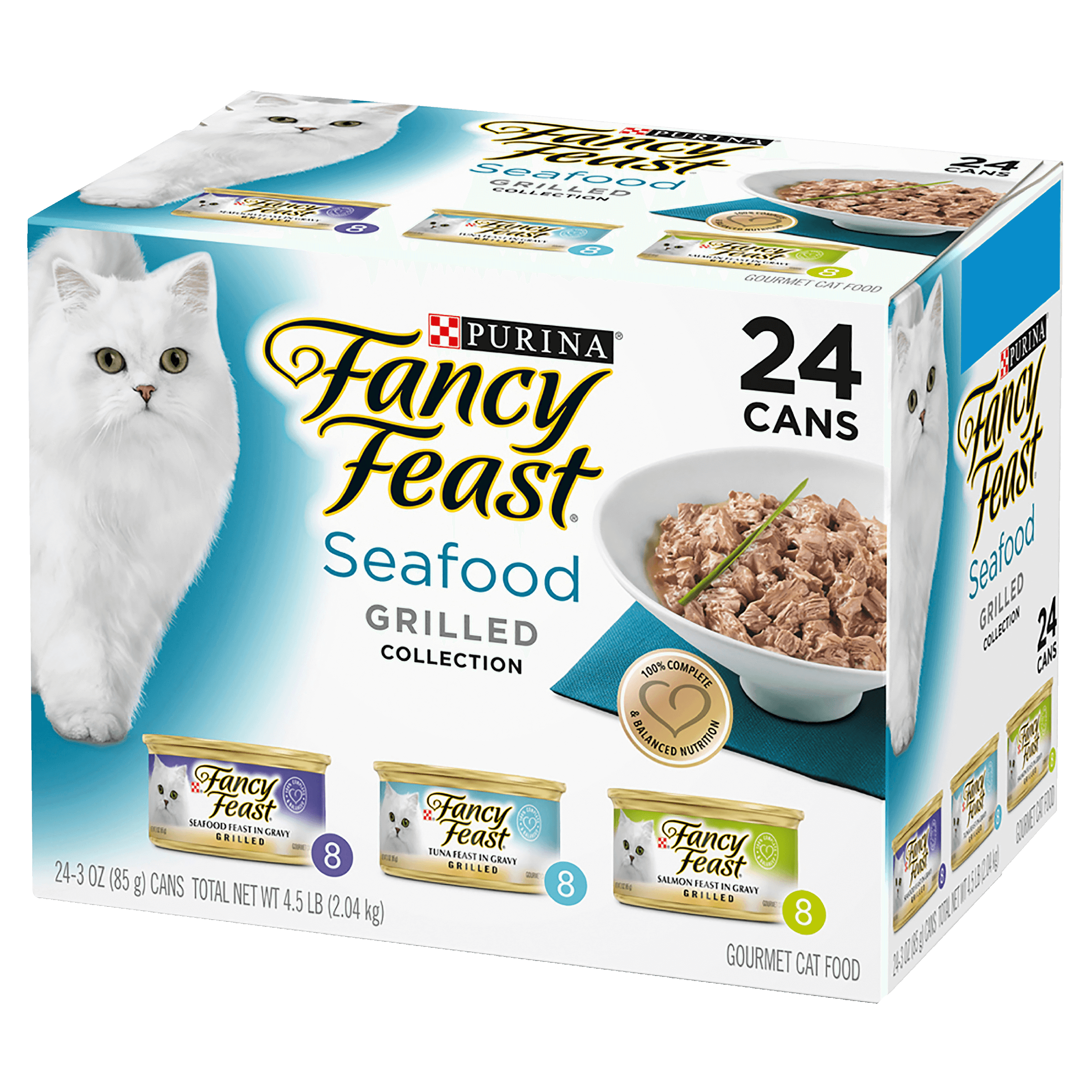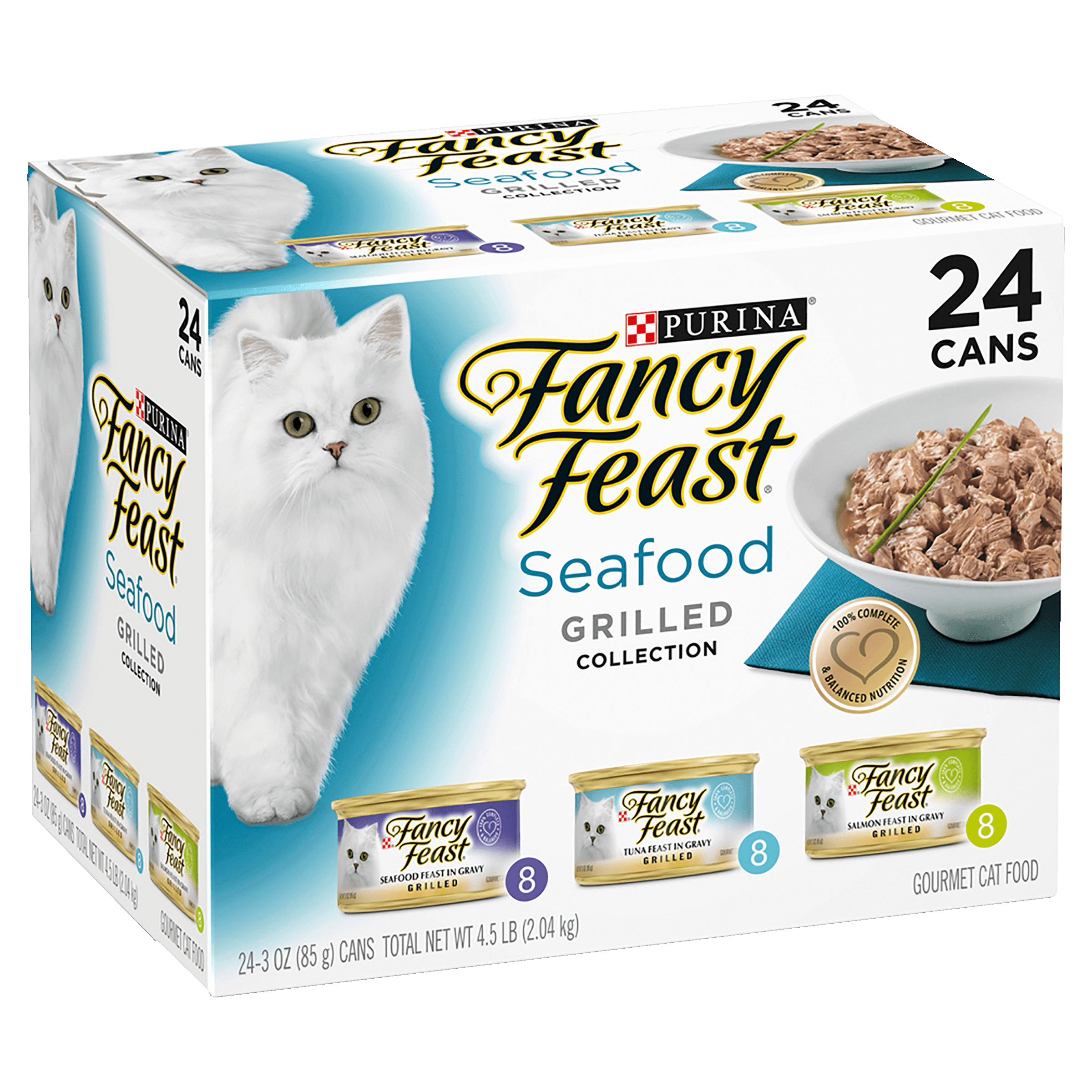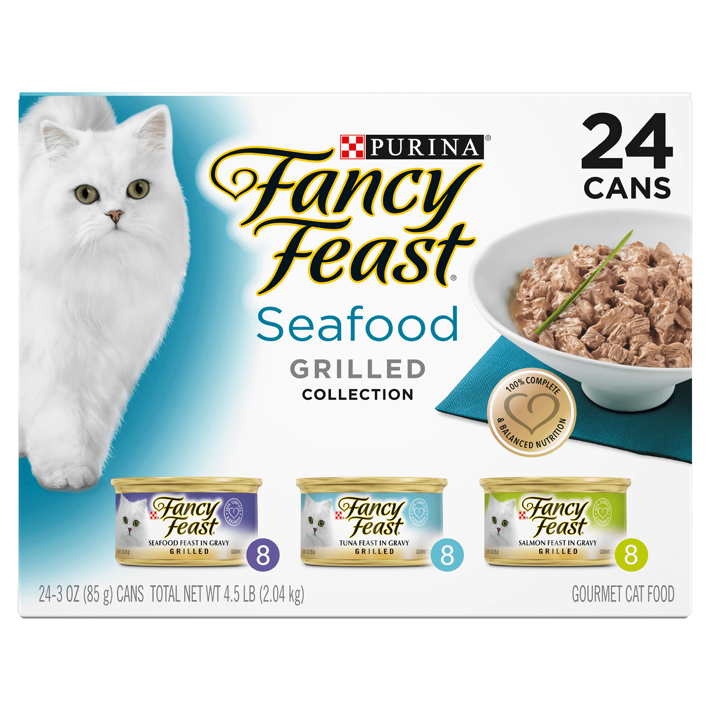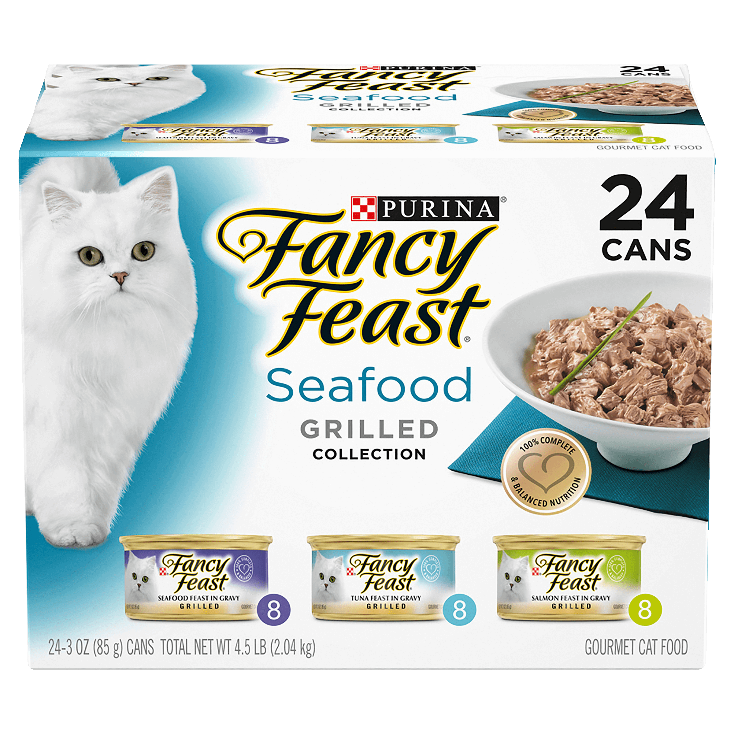 FANCY FEAST Classic Grilled Seafood is a highly palatable, gourmet wet cat food made for adult cats. This collection pack features a delicious combination of your cat’s favourite flavours in the texture they love. Grilled cuts made with seafood, salmon and tuna, slow-cooked to perfection in a succulent gravy. A glorious feast for your cat! Available in a convenient 24 pack, consisting of 8 x seafood, 8 x tuna and 8 x salmon flavour varieties.