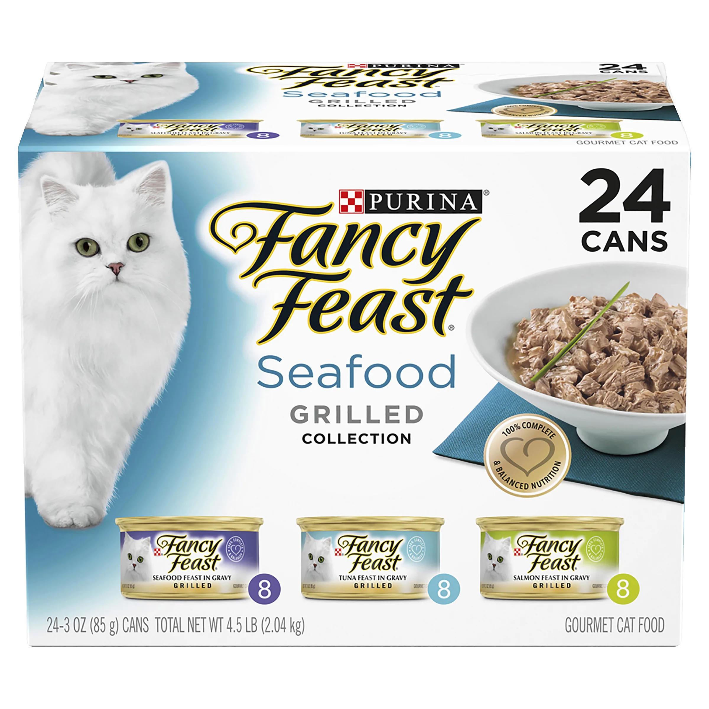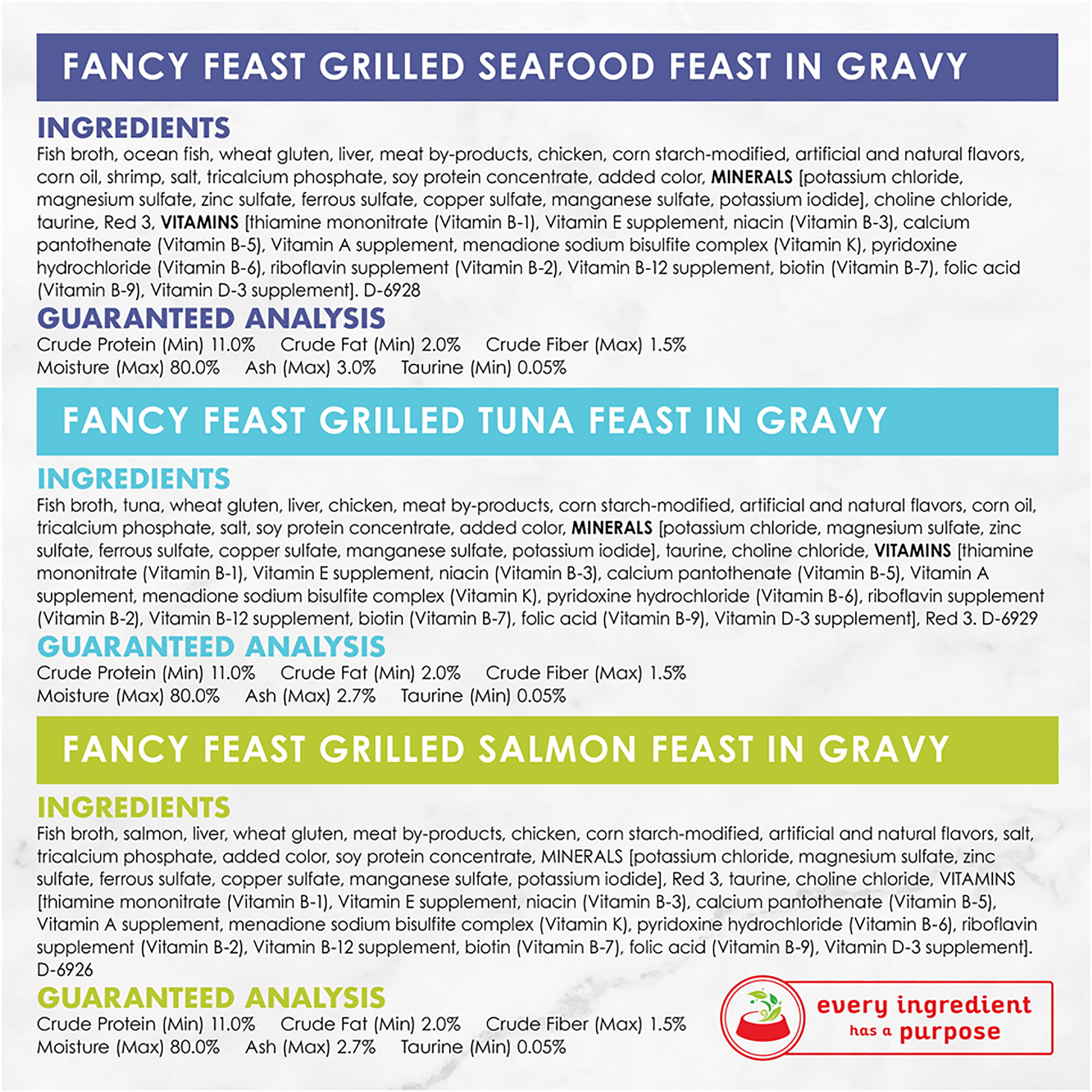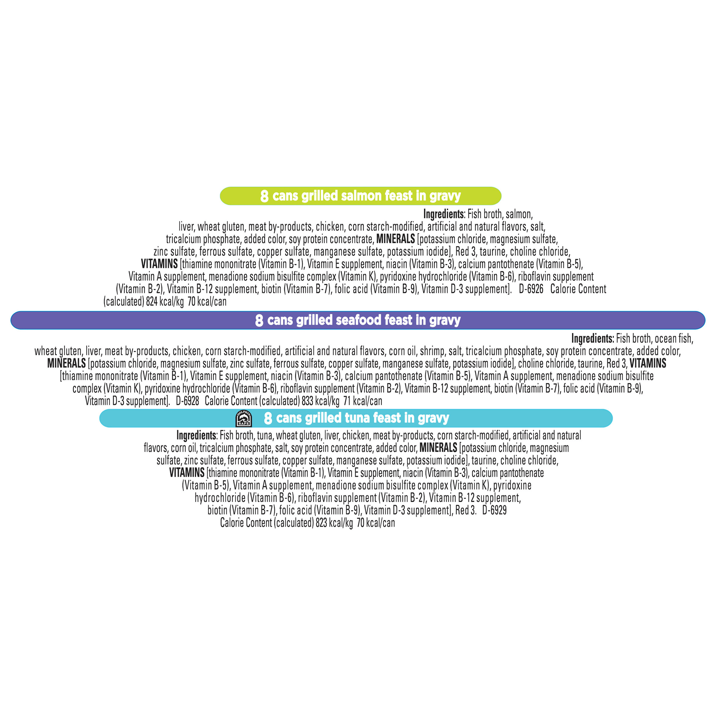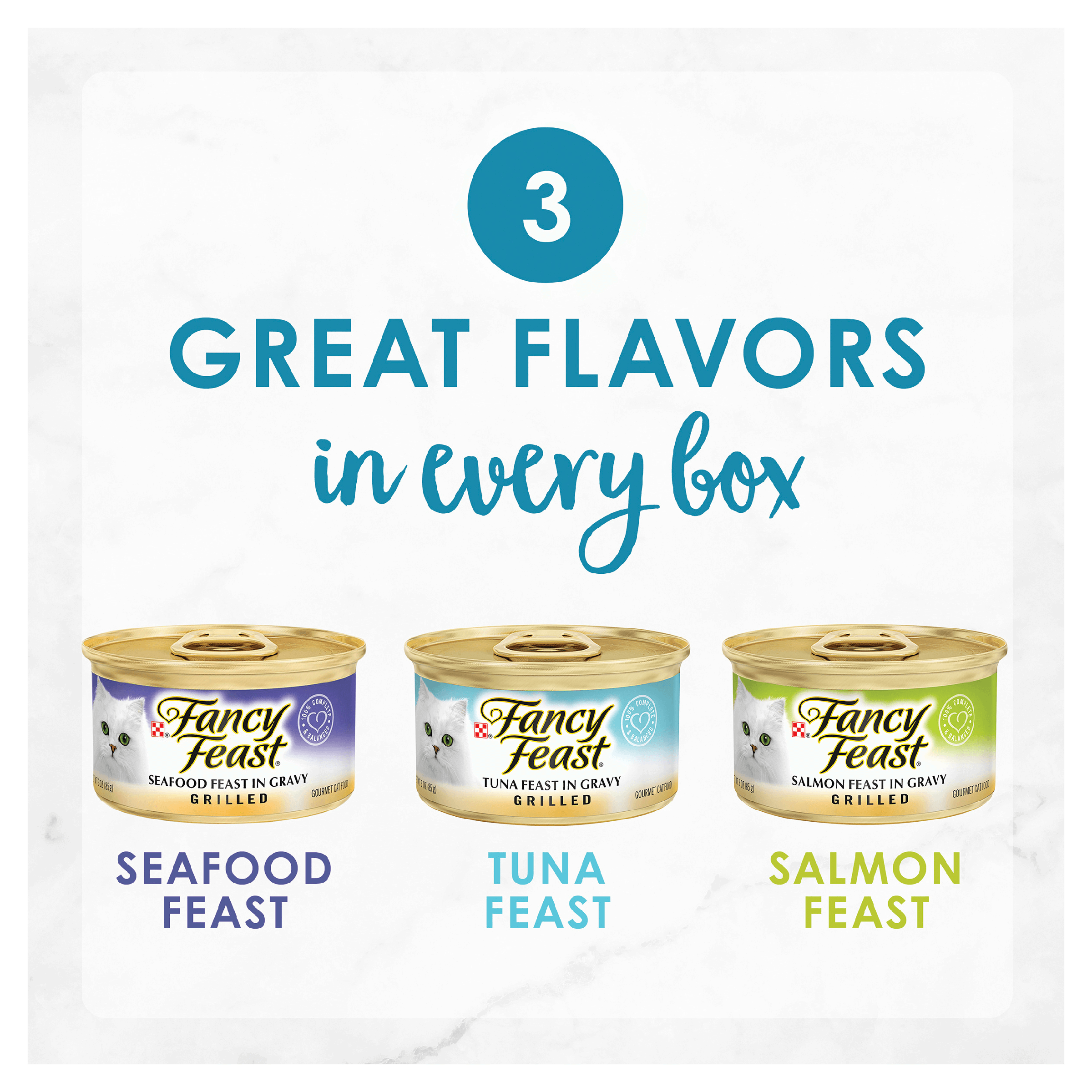 FANCY FEAST Classic Grilled Seafood is a highly palatable, gourmet wet cat food made for adult cats. This collection pack features a delicious combination of your cat’s favourite flavours in the texture they love. Grilled cuts made with seafood, salmon and tuna, slow-cooked to perfection in a succulent gravy. A glorious feast for your cat! Available in a convenient 24 pack, consisting of 8 x seafood, 8 x tuna and 8 x salmon flavour varieties.