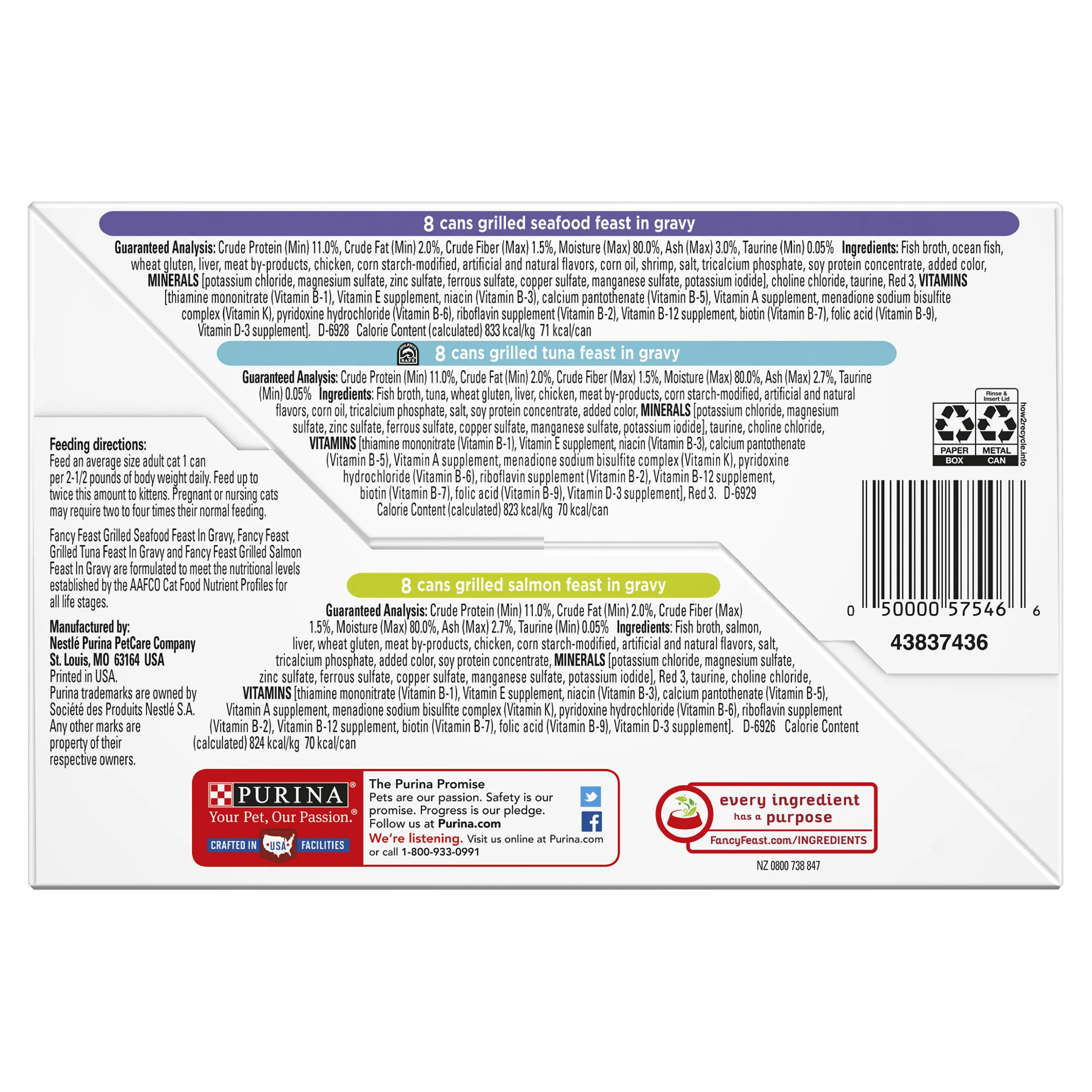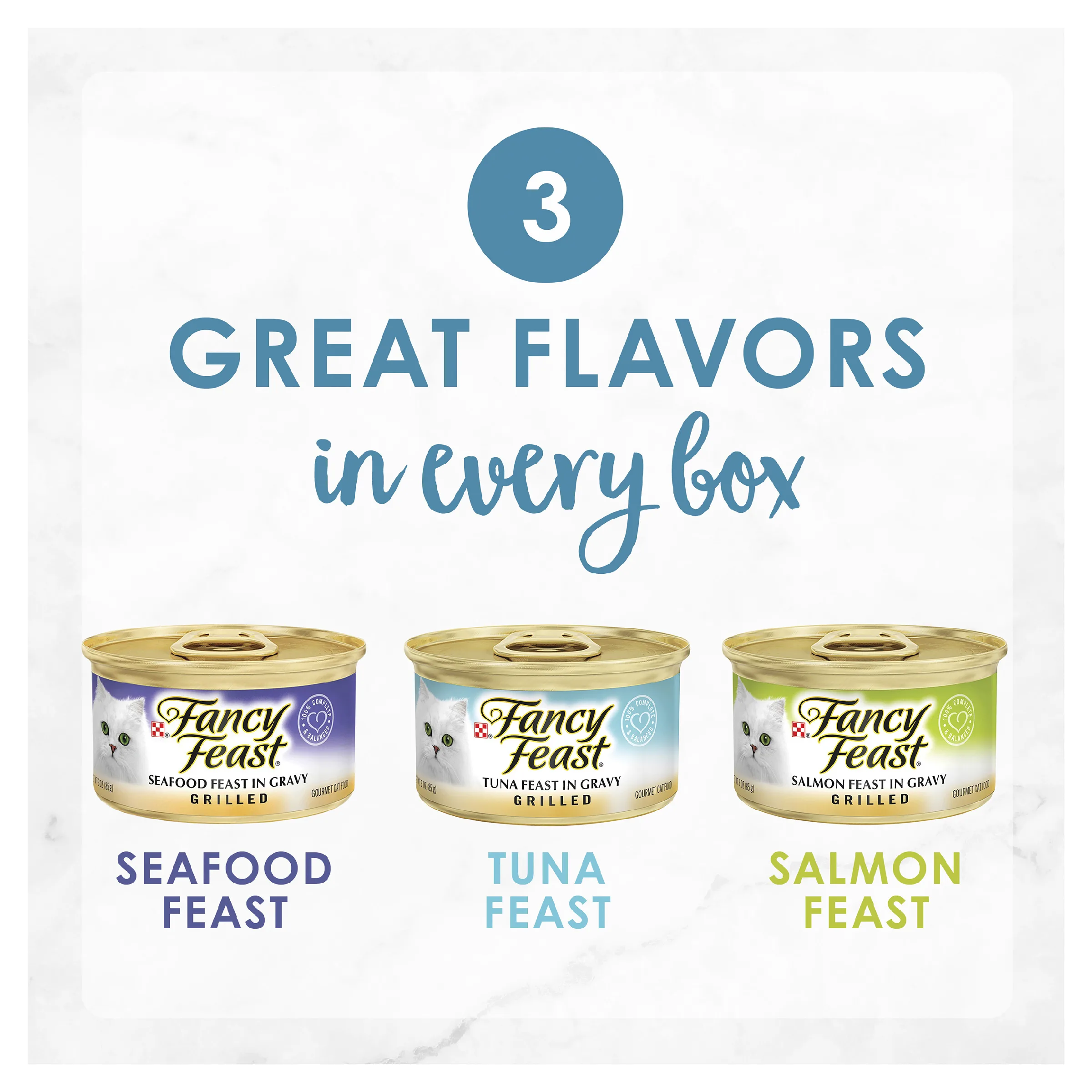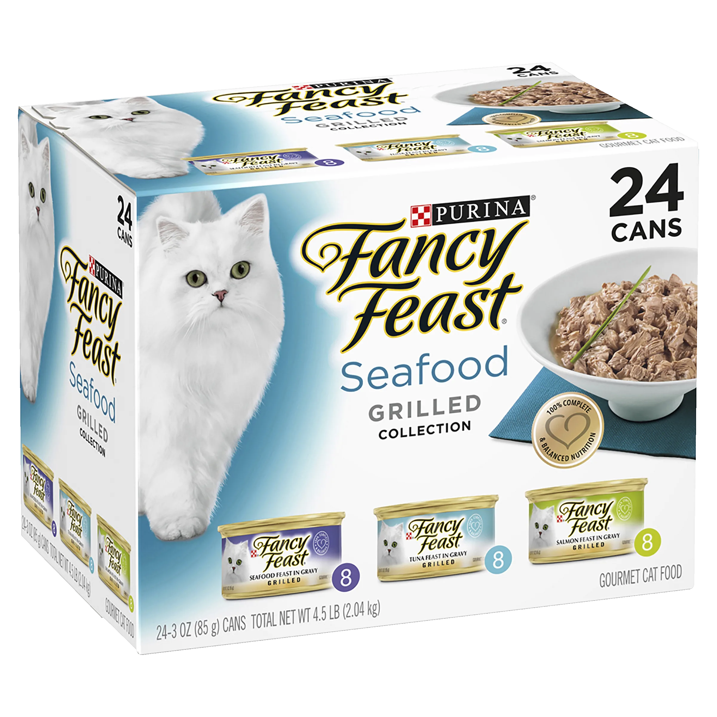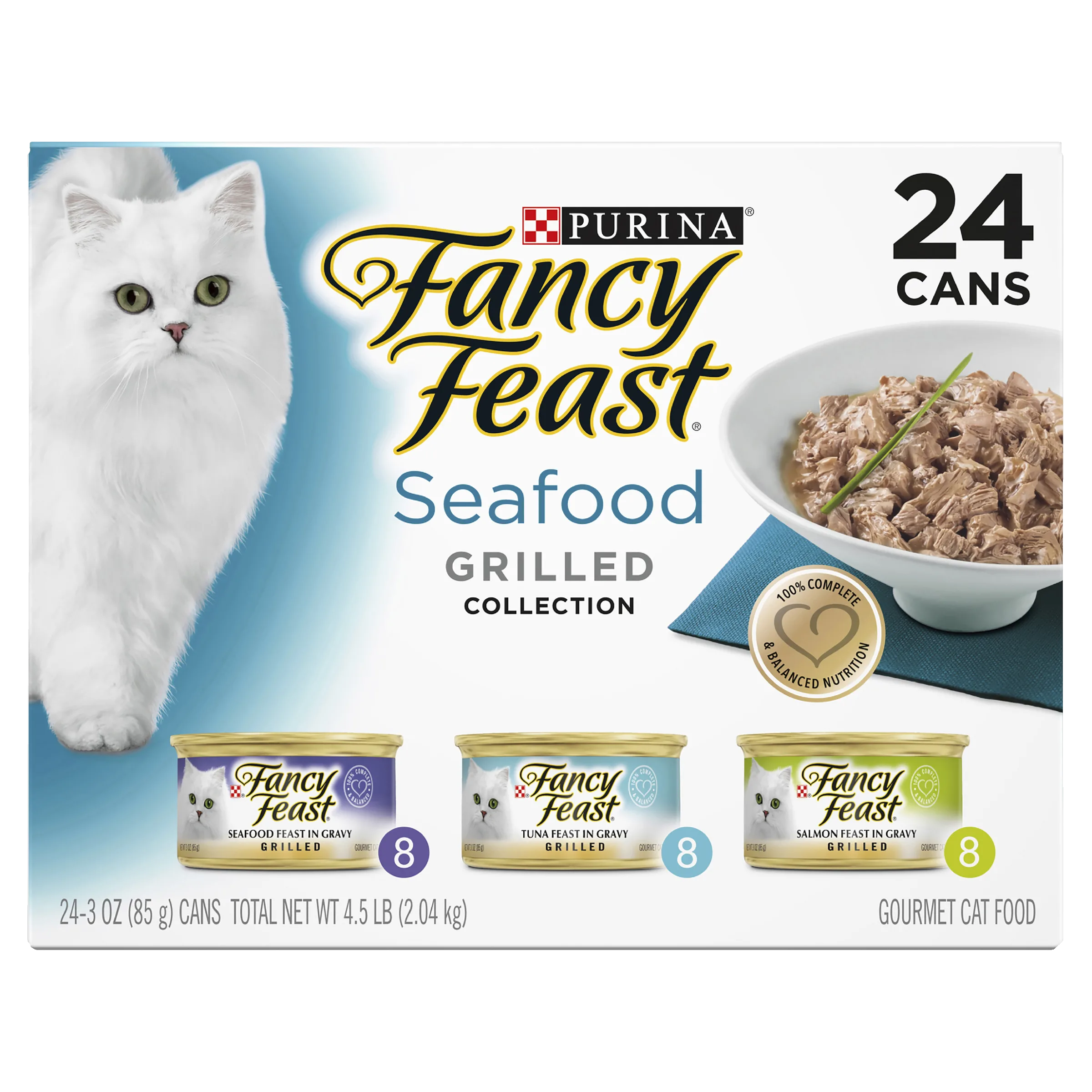 FANCY FEAST Classic Grilled Seafood is a highly palatable, gourmet wet cat food made for adult cats. This collection pack features a delicious combination of your cat’s favourite flavours in the texture they love. Grilled cuts made with seafood, salmon and tuna, slow-cooked to perfection in a succulent gravy. A glorious feast for your cat! Available in a convenient 24 pack, consisting of 8 x seafood, 8 x tuna and 8 x salmon flavour varieties.