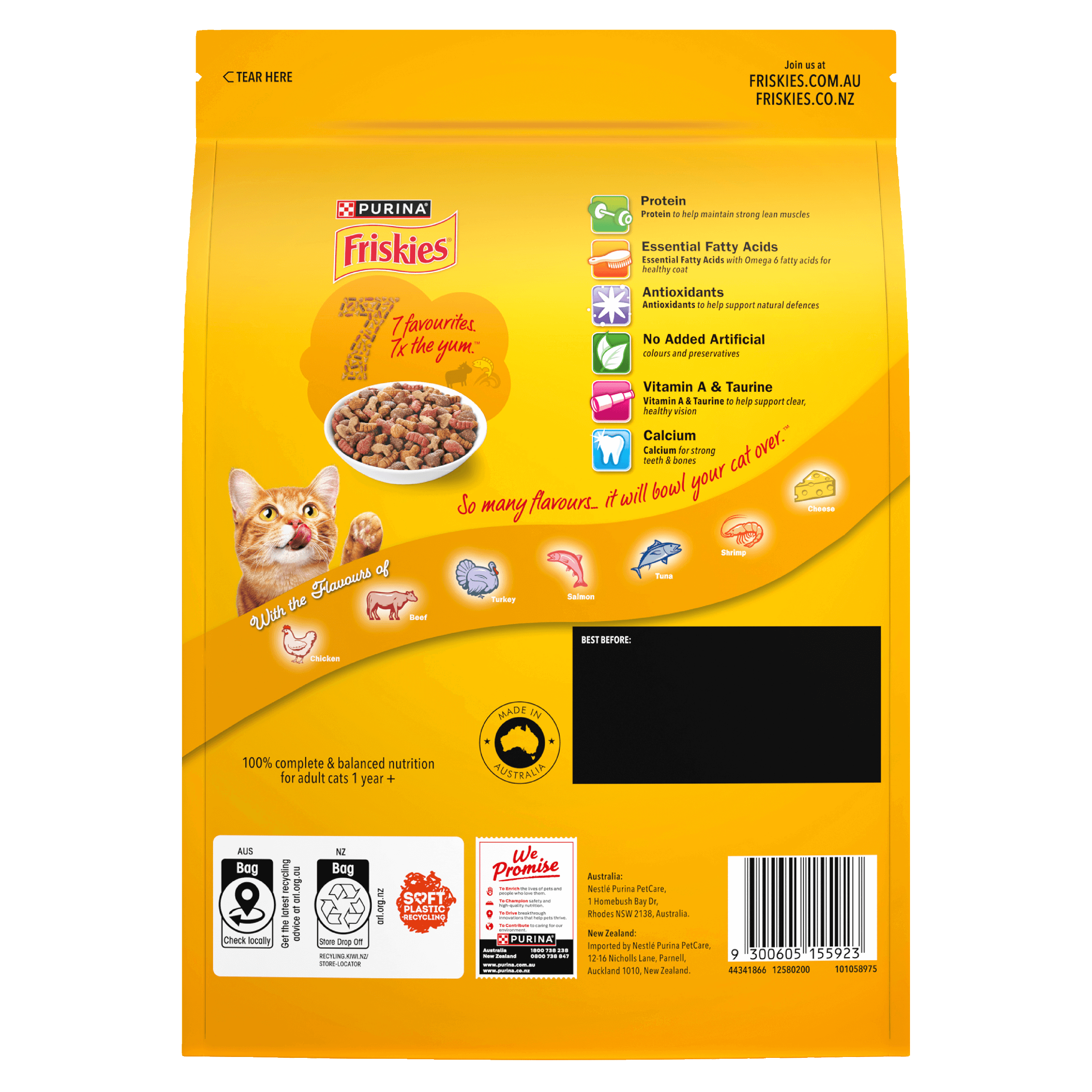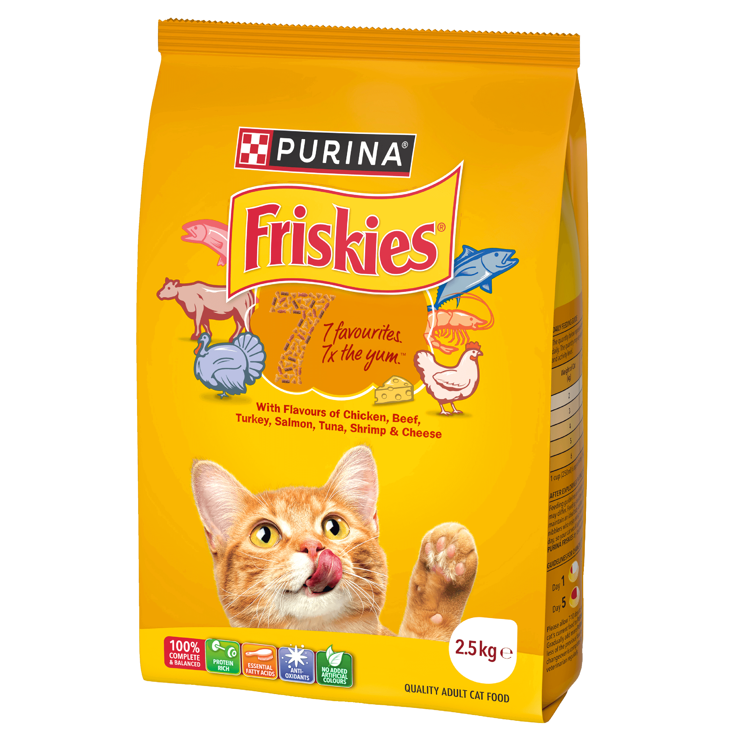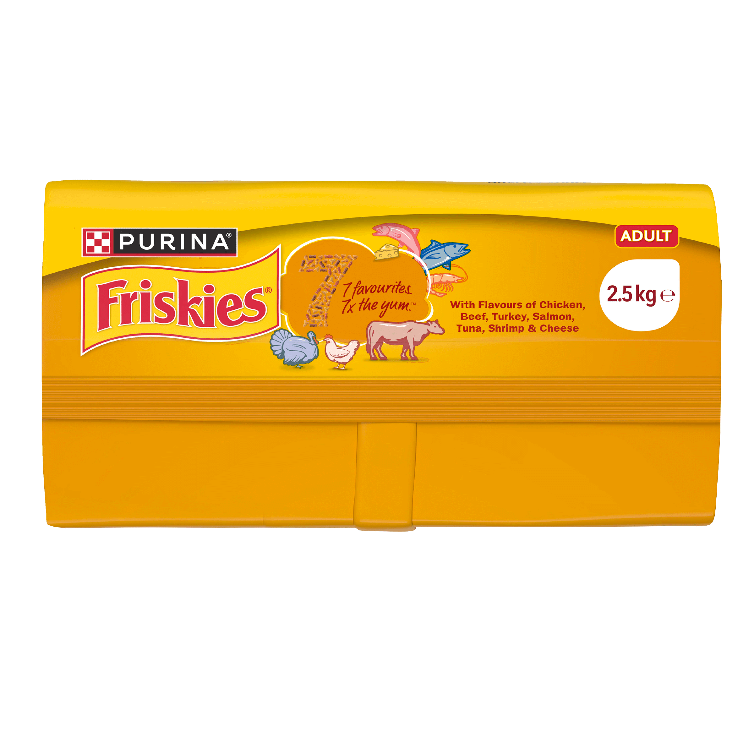 FRISKIES 7® is made up of kibble biscuits in a variety of meat and seafood shapes with the flavours of chicken, beef, turkey, salmon, tuna, shrimp and cheese. 7 of your cats favourite flavours for 7 x the yum. It will bowl your cat over.