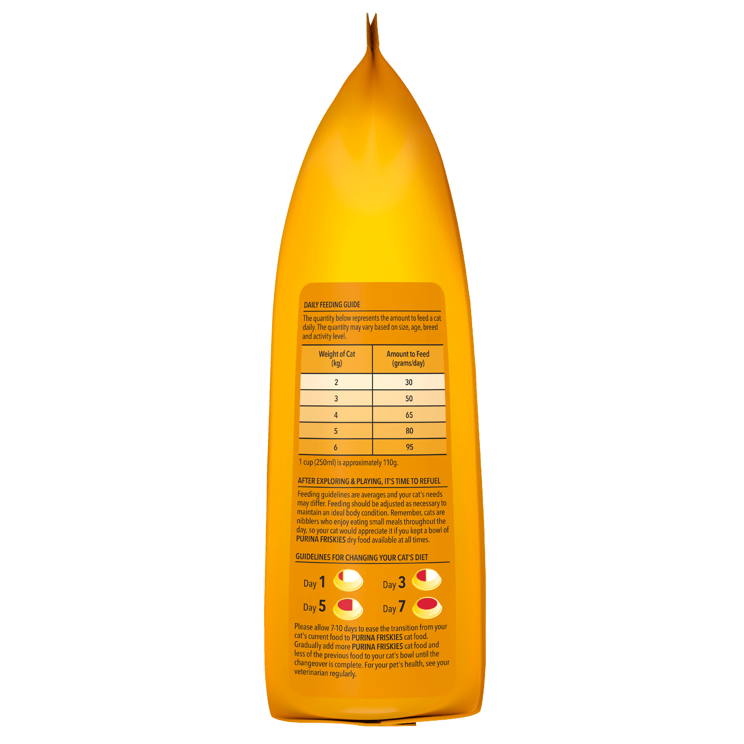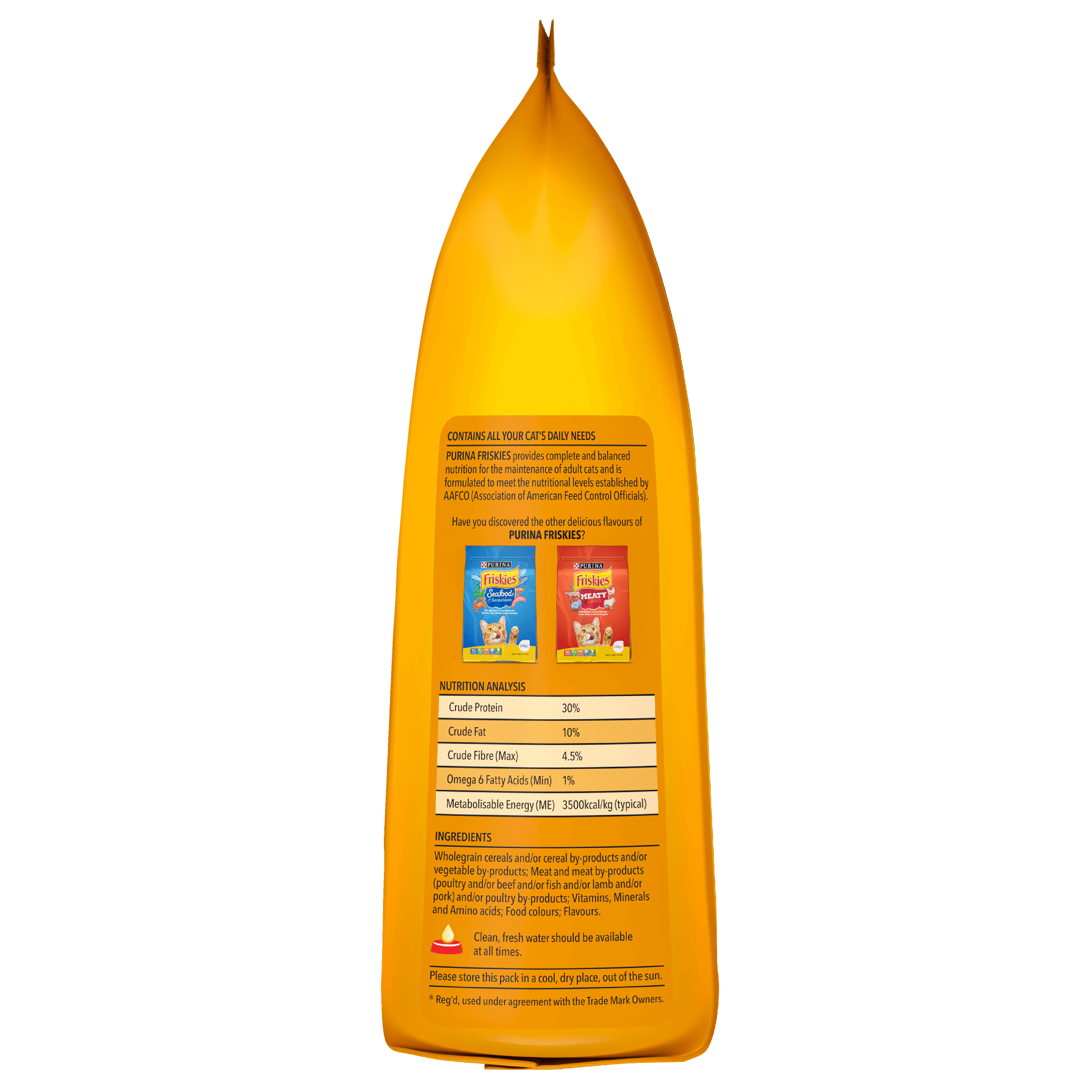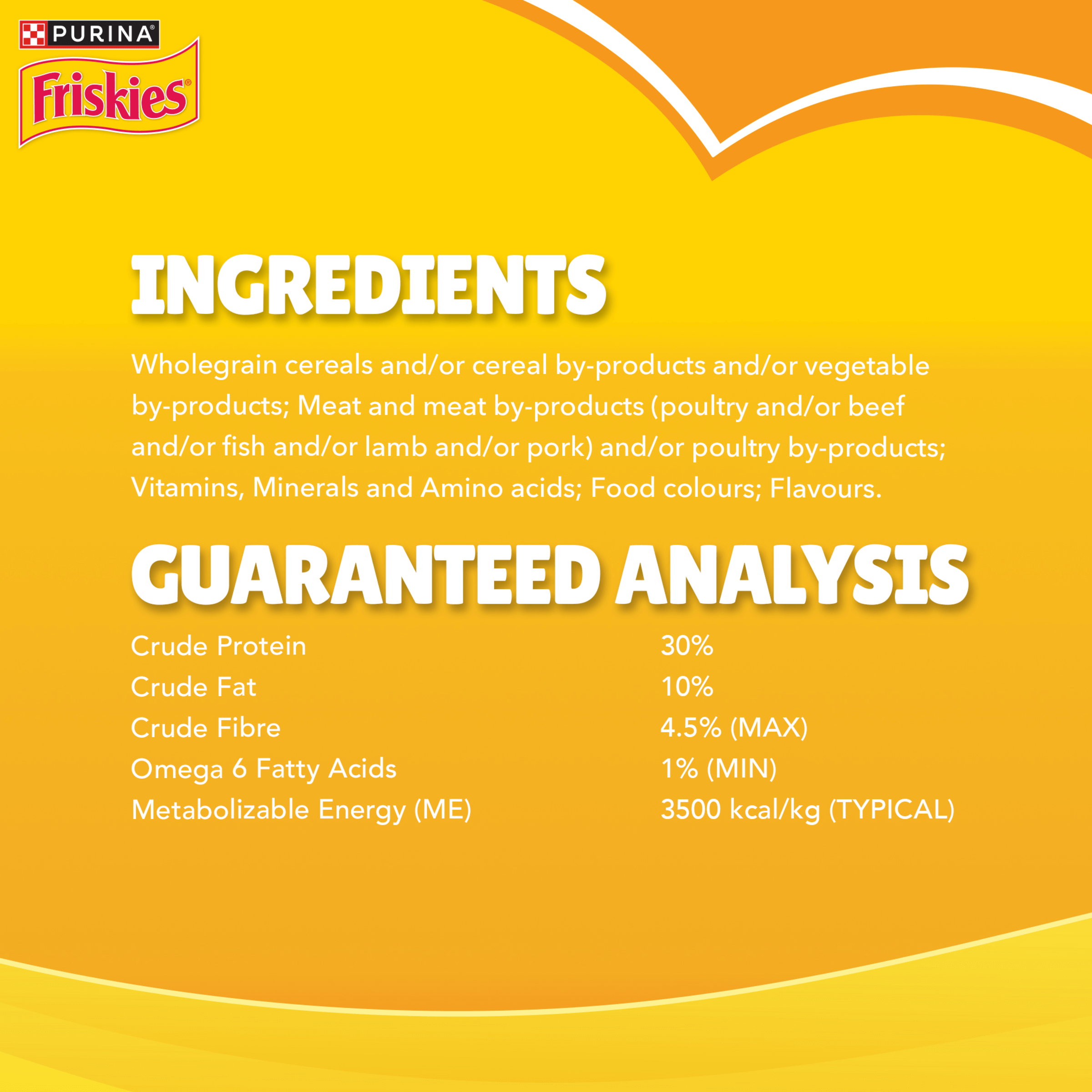 FRISKIES 7® is made up of kibble biscuits in a variety of meat and seafood shapes with the flavours of chicken, beef, turkey, salmon, tuna, shrimp and cheese. 7 of your cats favourite flavours for 7 x the yum. It will bowl your cat over.