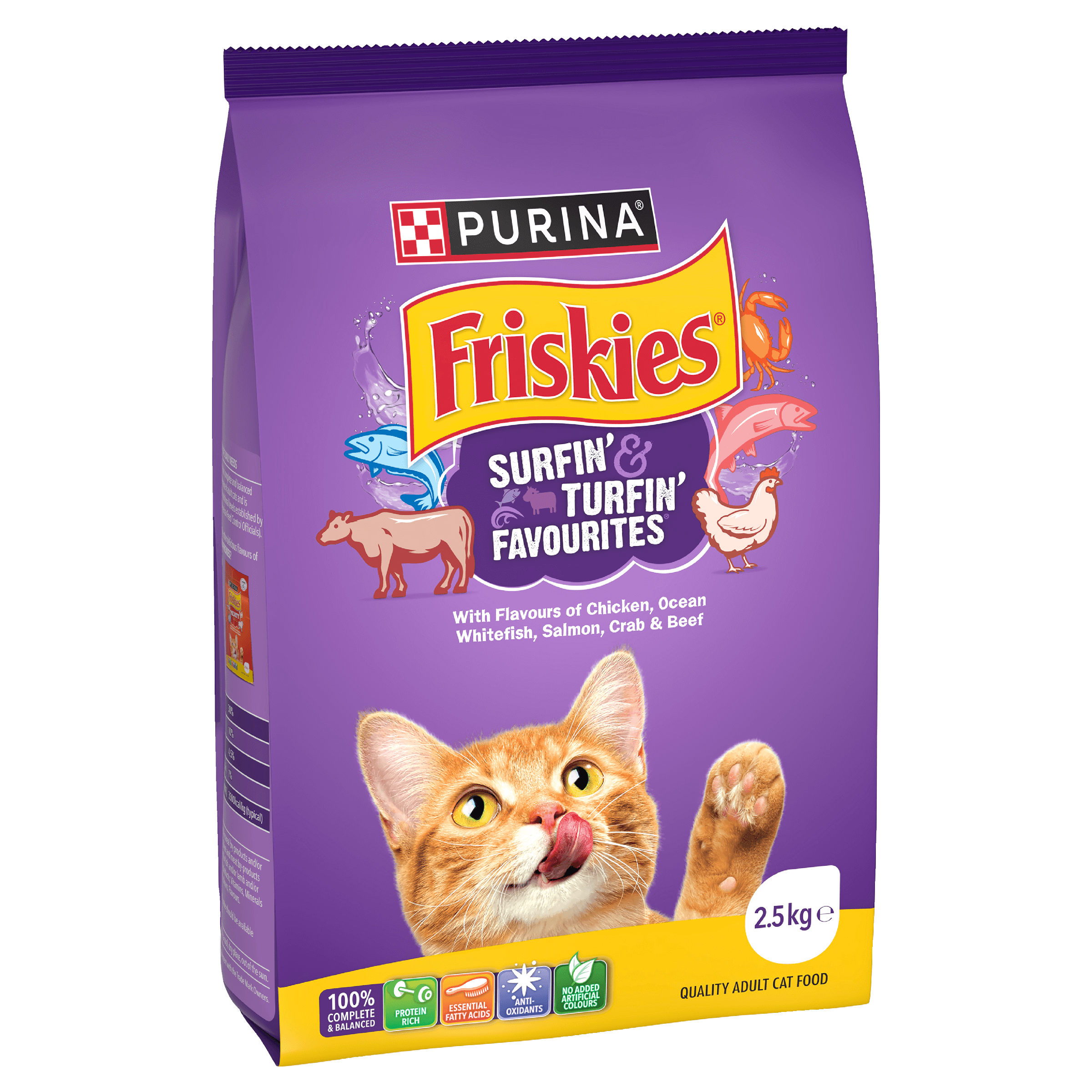 FRISKIES Surfin’ & Turfin’® is the best of land and sea together in one bag, with enticing aromas and appealing shapes, including chicken, beef, ocean whitefish, crab and salmon. It’s more than just a delicious meal, it’s a sensory journey filled with wonder and delight. Unlock a world of sensory delight for your cat by feeding them FRISKIES dry cat food.