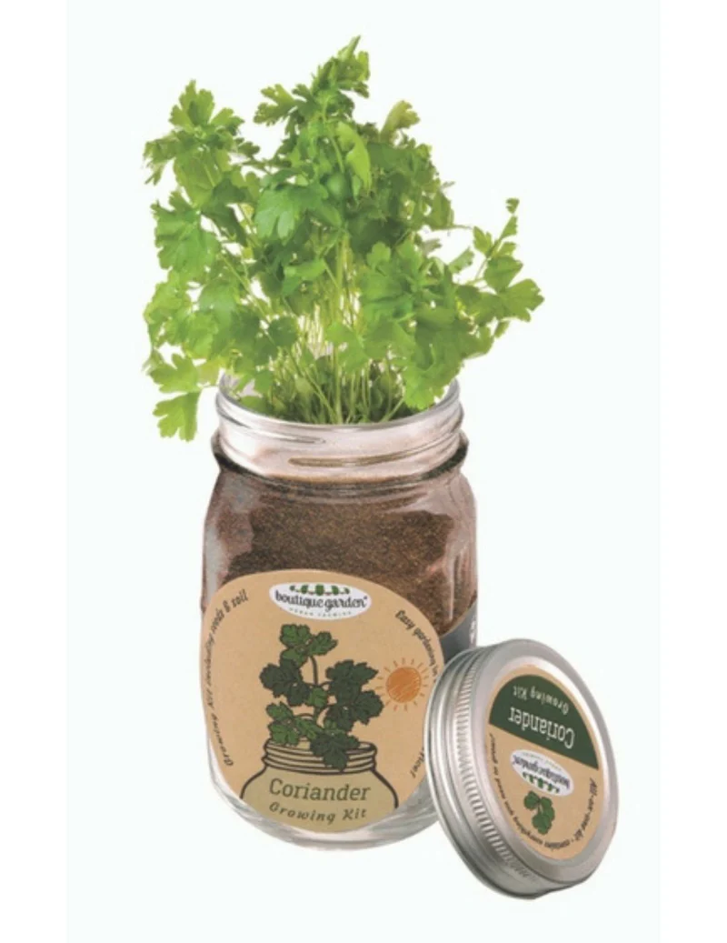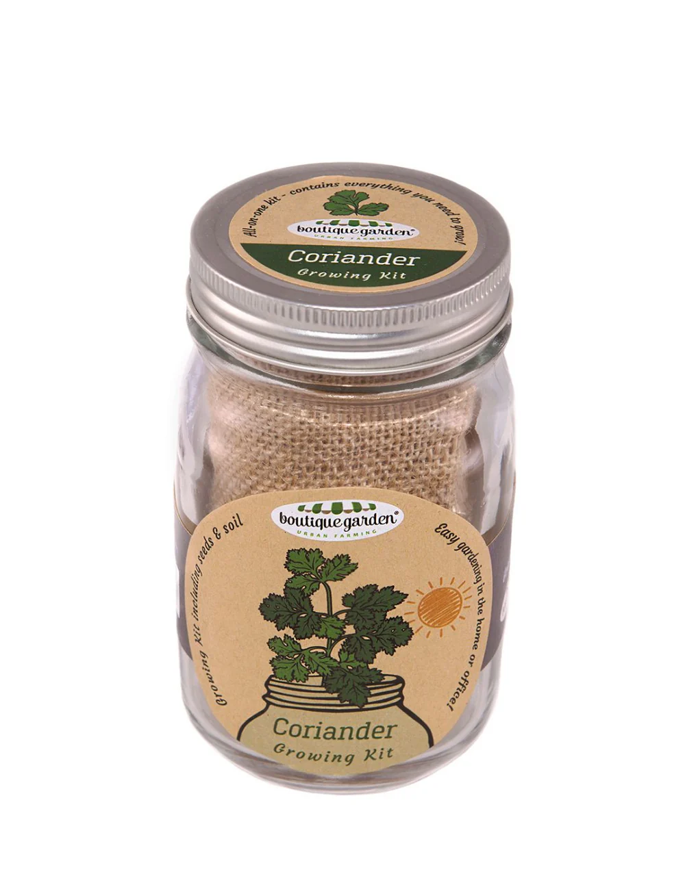 Each kit includes mason jar, seed packet (Coriander), soil pellet, a burlap bag and growing instructions.