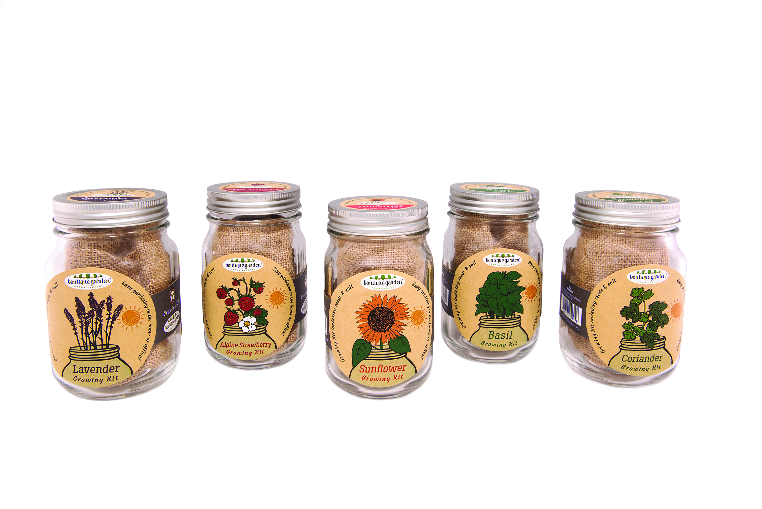 Each kit includes mason jar, seed packet (Sunflower Dwarf EOS), soil pellet, a burlap bag and growing instructions.