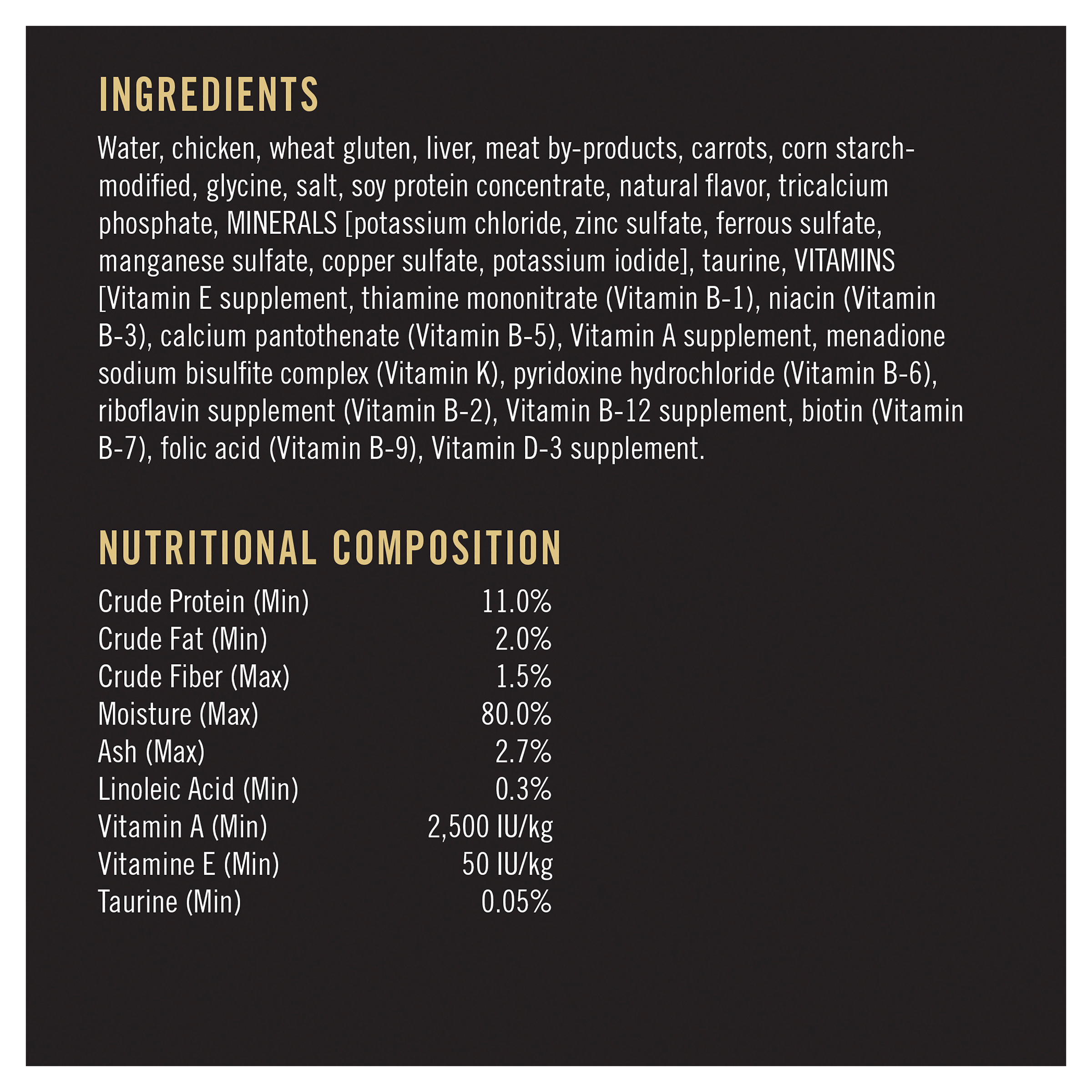 Water, chicken, wheat gluten, liver, meat by-products, carrots, corn starch-modified, glycine, salt, soy protein concentrate, natural flavor, tricalcium phosphate, MINERALS [potassium chloride, zinc sulfate, ferrous sulfate, manganese sulfate, copper sulfate, potassium iodide], taurine, VITAMINS [Vitamin E supplement, thiamine mononitrate (Vitamin B-1), niacin (Vitamin B-3), calcium pantothenate (Vitamin B-5), Vitamin A supplement, menadione sodium bisulfite complex (Vitamin K), pyridoxine hydrochloride (Vitamin B-6), riboflavin supplement (Vitamin B-2), Vitamin B-12 supplement, biotin (Vitamin B-7), folic acid (Vitamin B-9), Vitamin D-3 supplement.