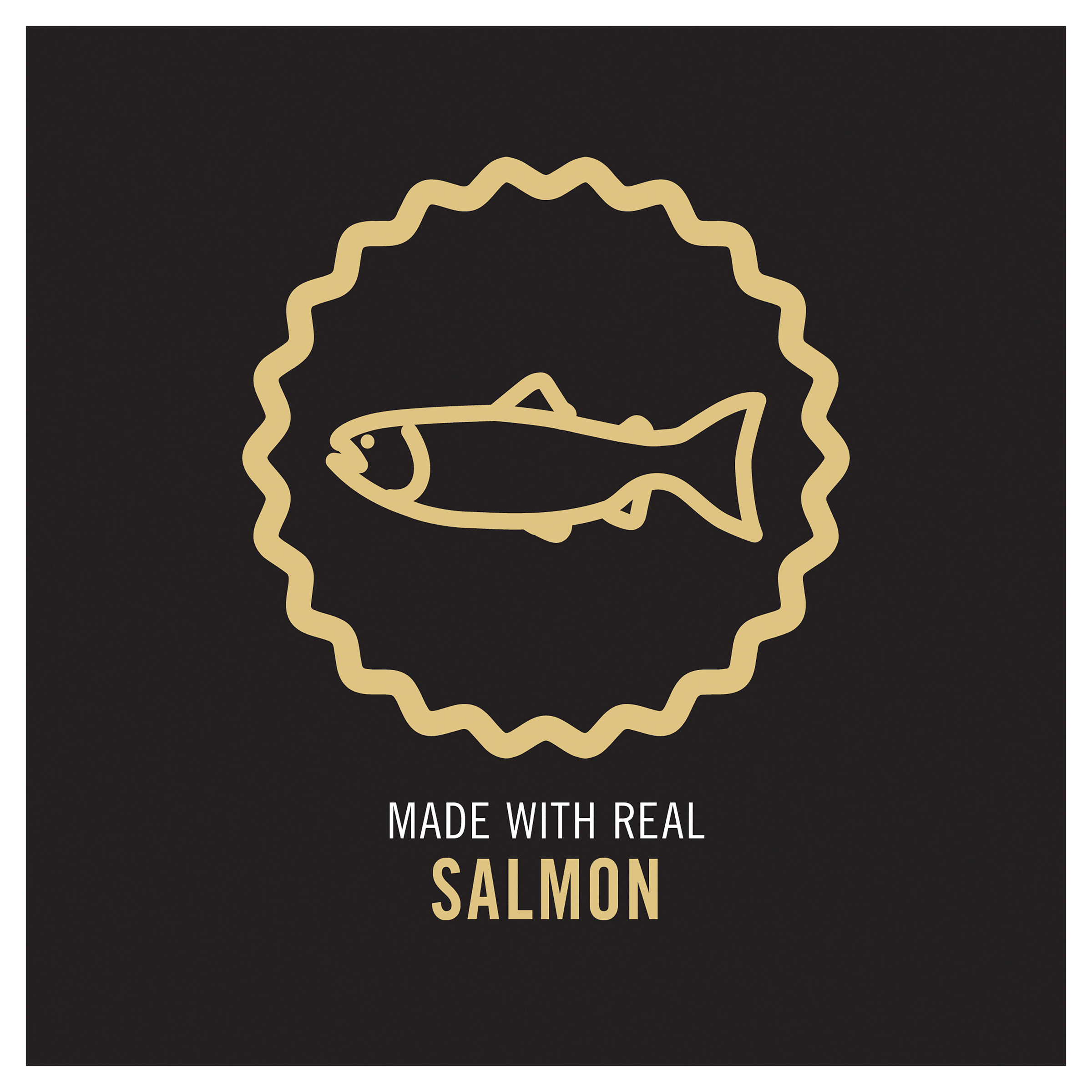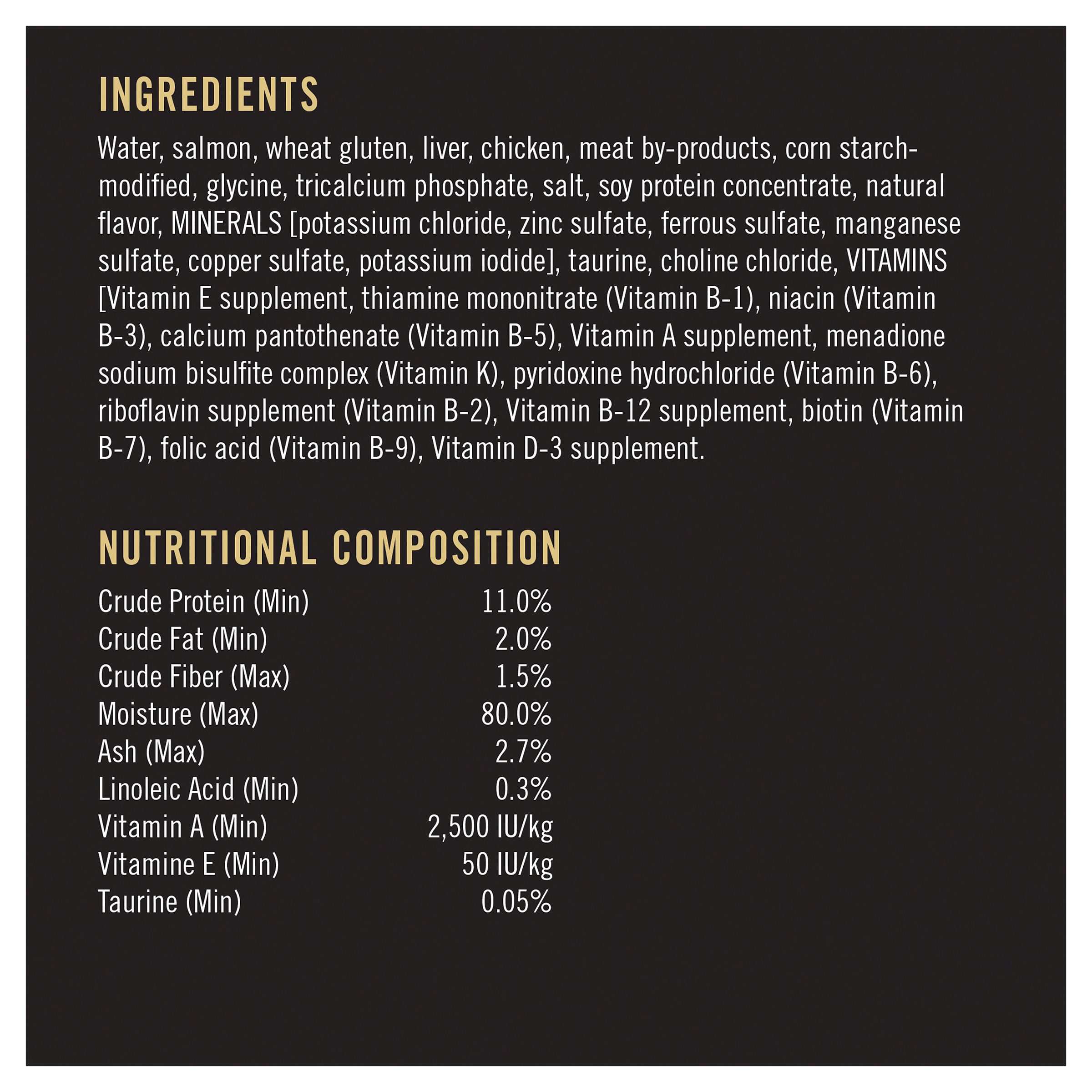 Water, salmon, wheat gluten, liver, chicken, meat by-products, corn starch-modified, glycine, tricalcium phosphate, salt, soy protein concentrate, natural flavor, MINERALS [potassium chloride, zinc sulfate, ferrous sulfate, manganese sulfate, copper sulfate, potassium iodide], taurine, choline chloride, VITAMINS [Vitamin E supplement, thiamine mononitrate (Vitamin B-1), niacin (Vitamin B-3), calcium pantothenate (Vitamin B-5), Vitamin A supplement, menadione sodium bisulfite complex (Vitamin K), pyridoxine hydrochloride (Vitamin B-6), riboflavin supplement (Vitamin B-2), Vitamin B-12 supplement, biotin (Vitamin B-7), folic acid (Vitamin B-9), Vitamin D-3 supplement.
