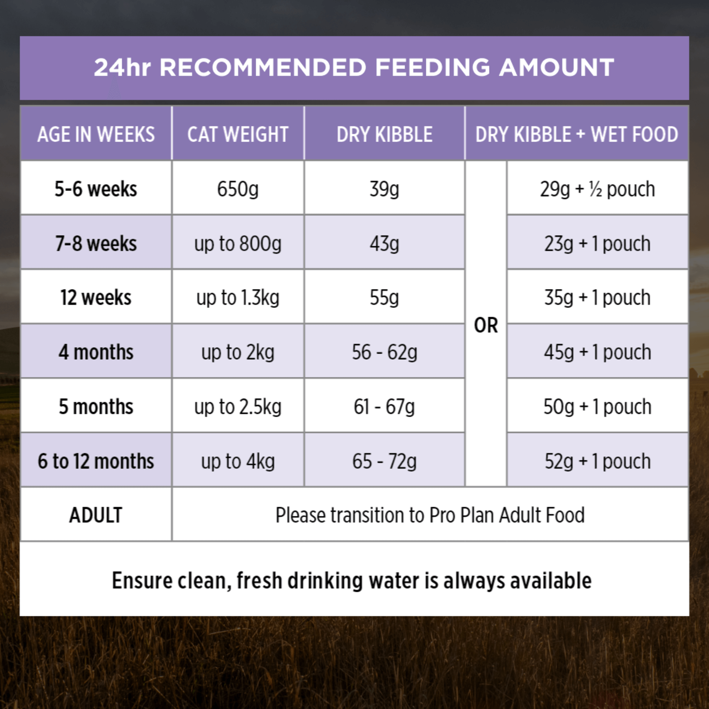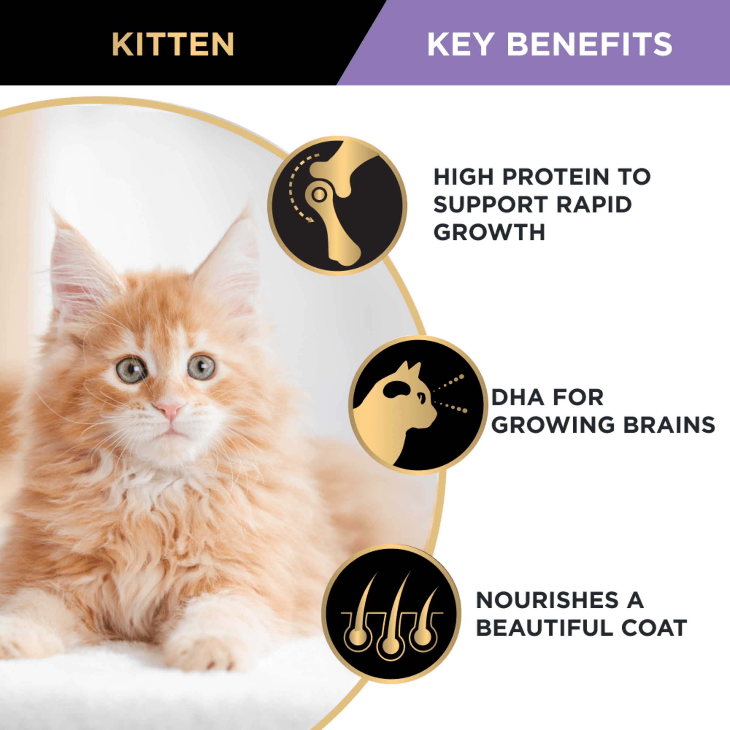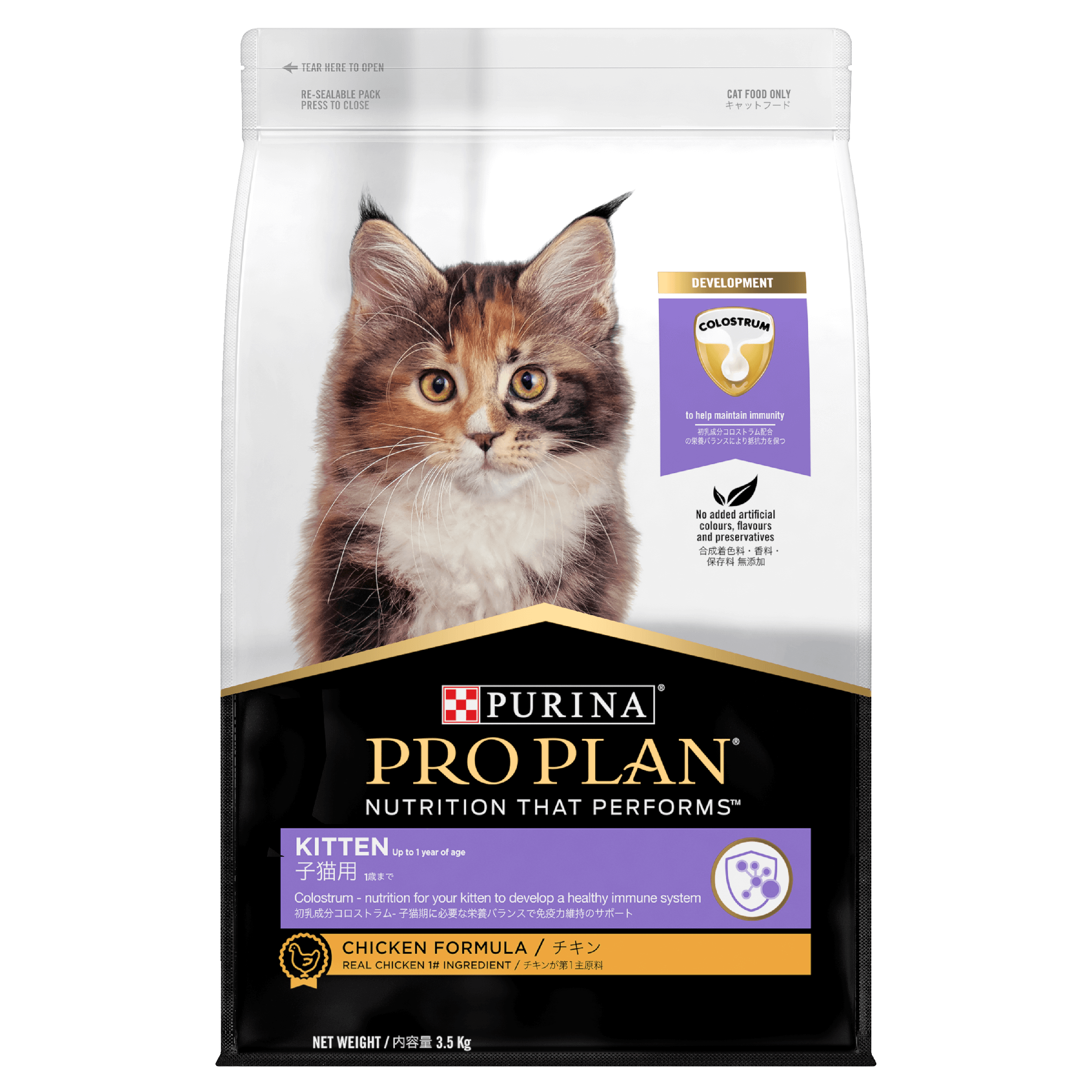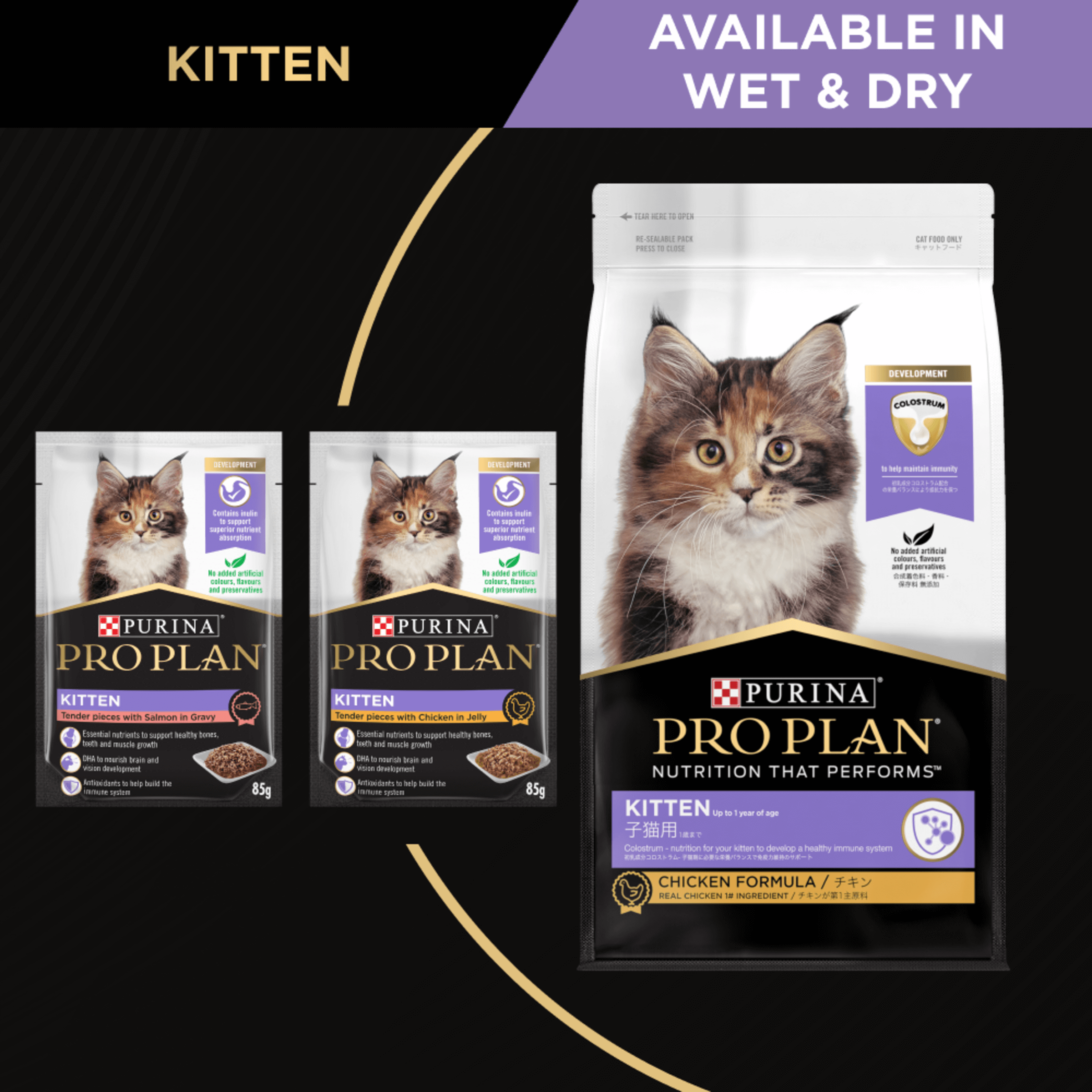 PRO PLAN® KITTEN, CHICKEN combines all essential nutrients including DHA, vitamins C and D with colostrum, in a high protein diet for kittens. Suitable for kittens up to 1 year before they transition to adult food.