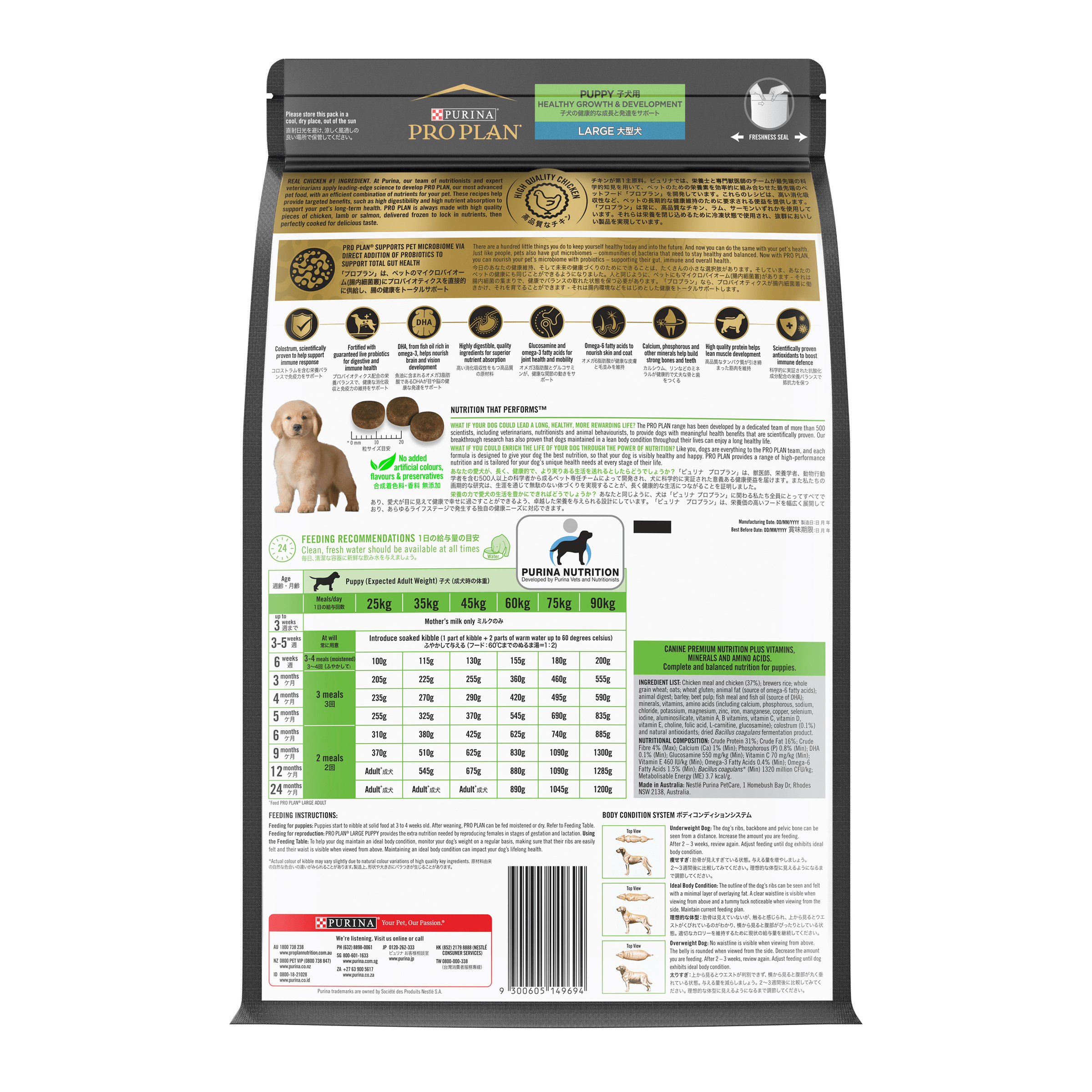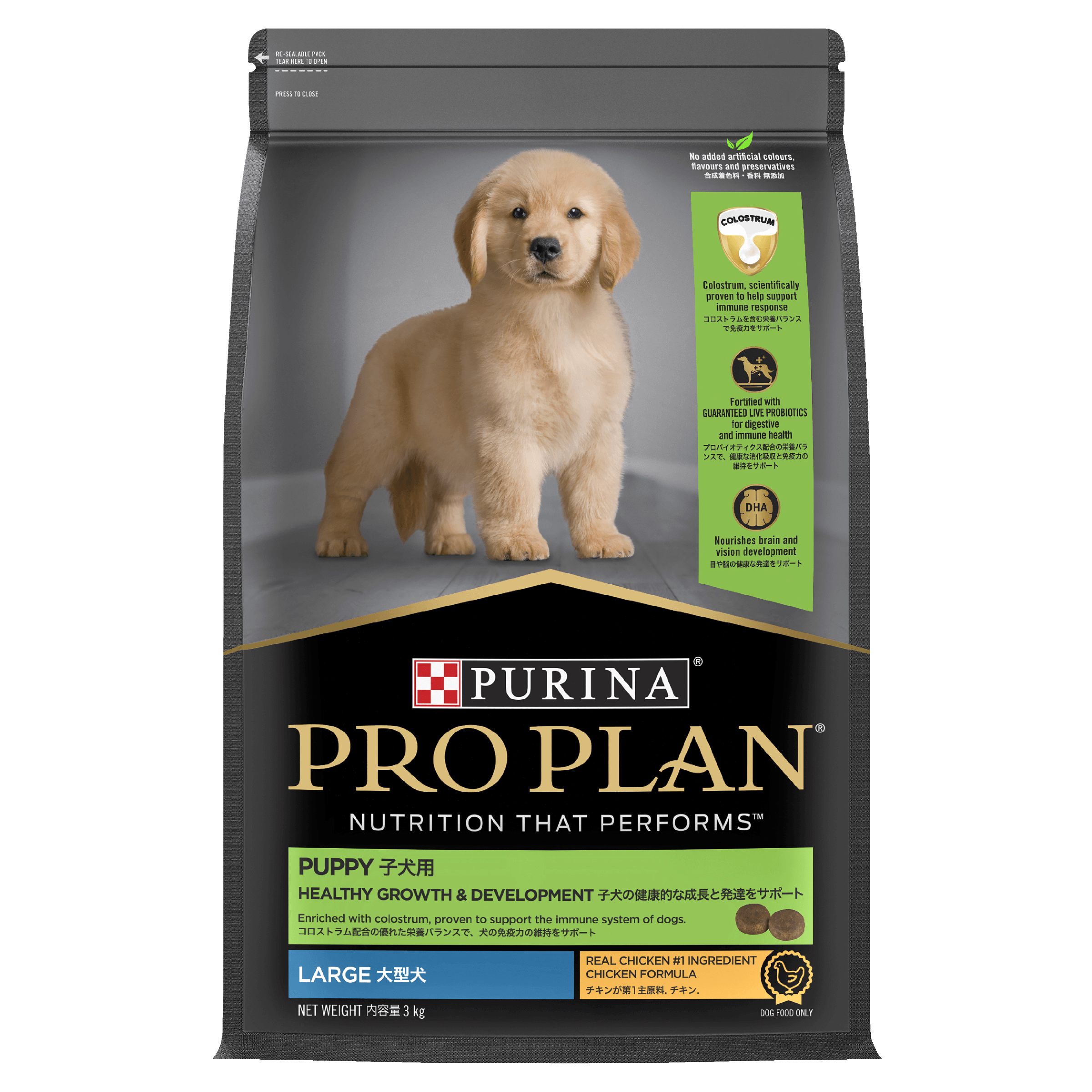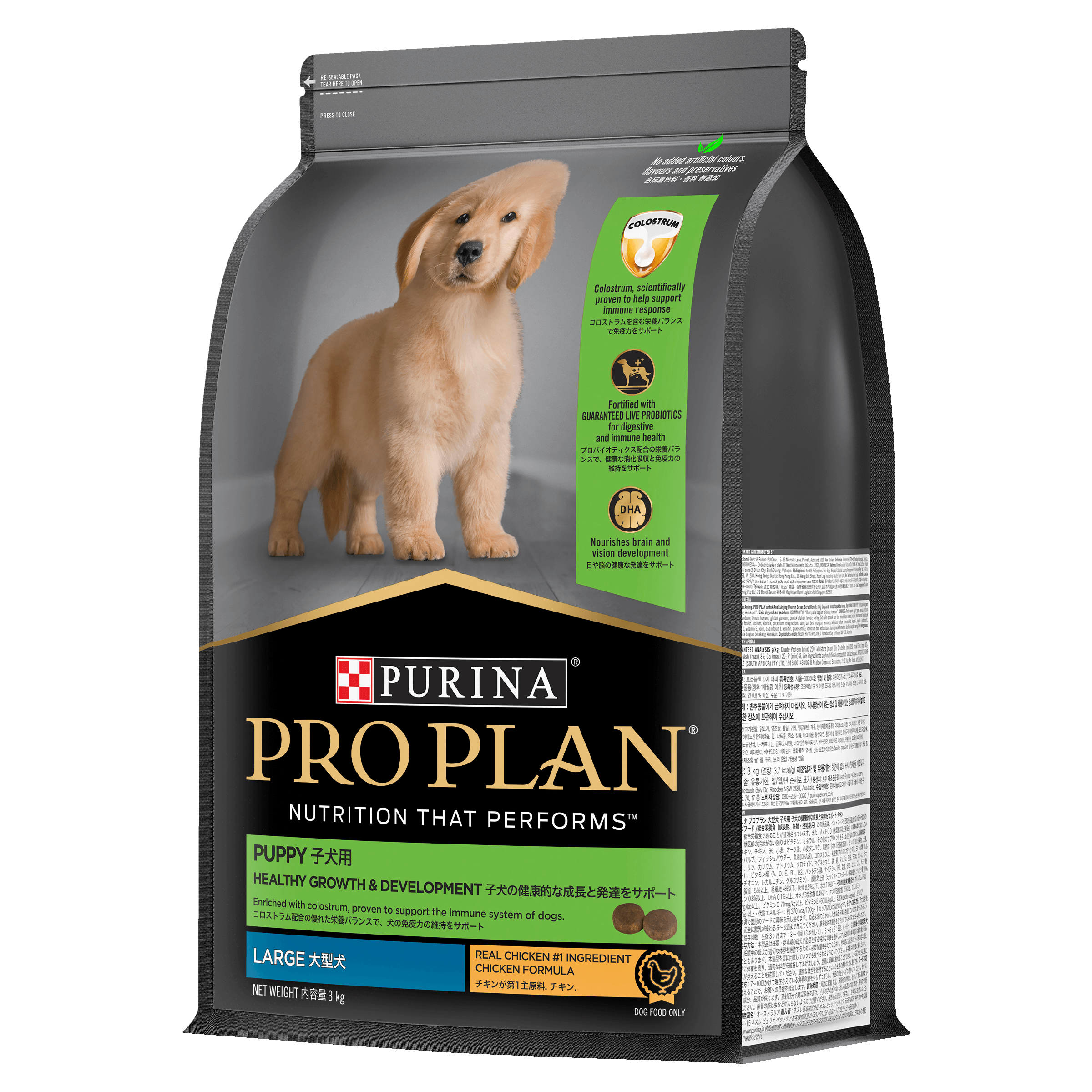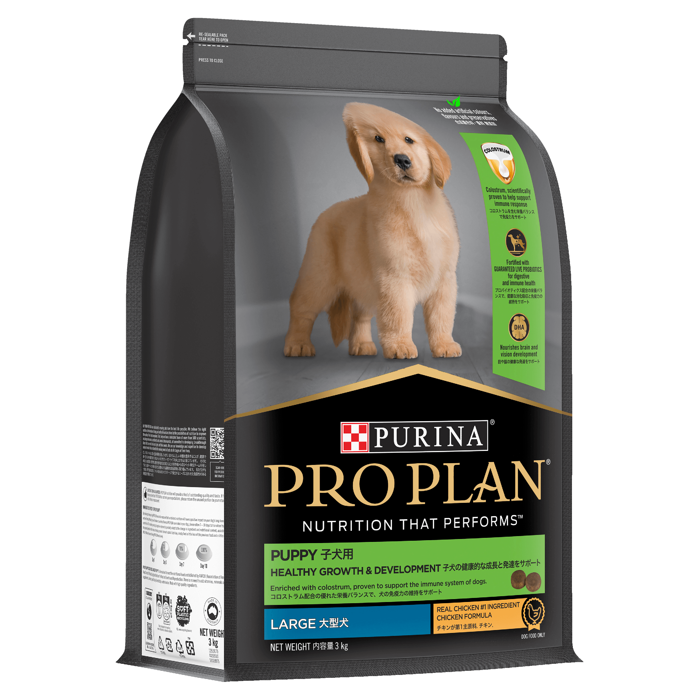 Prep your pup for a lifetime of vitality Proper nutrition, followed by the right care and cuddles, will help nurture your pup’s health and well-being. PRO PLAN® Healthy Growth and Development puppy food features a unique combination of live Probiotics and Colostrum. These innovative ingredients support the development of your puppy’s immature digestive and immune systems. Omega-6 fatty acids nourish that gorgeous new skin and fluffy coat. And a blend of other essential nutrients come together to help your pup thrive. DHA helps developing brains and eyes, while Calcium and Phosphorus help build strong bones and teeth. Fuel their lifetime of health and happiness with this premium puppy formula, tailor-made for their first year.