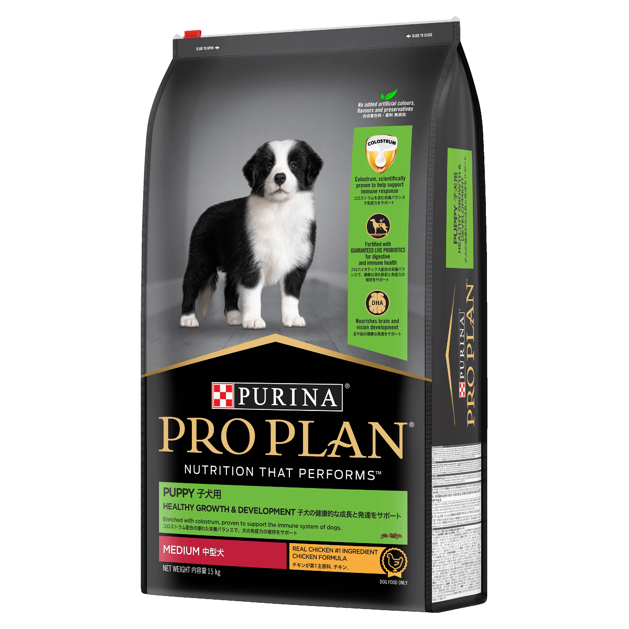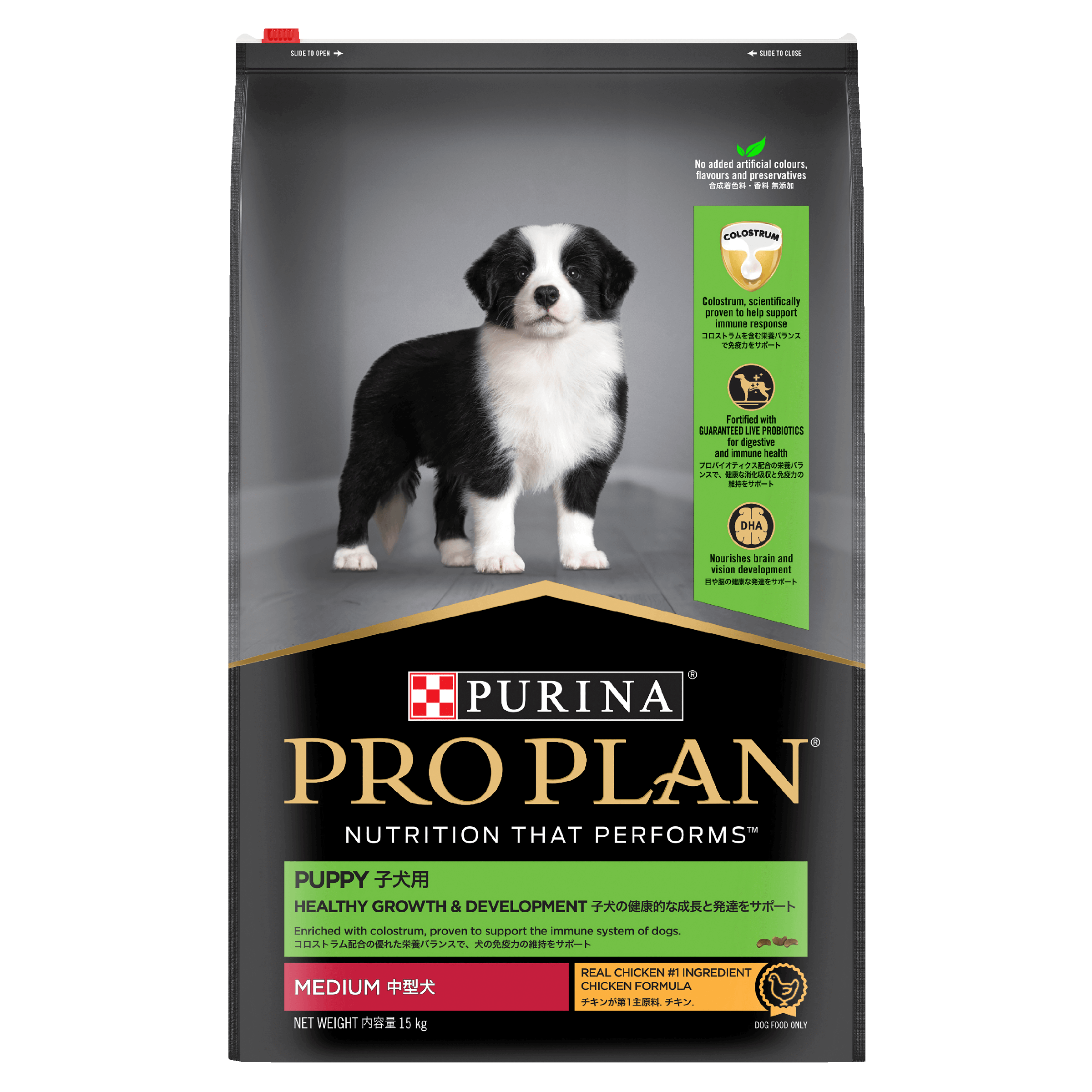 Prep your pup for a lifetime of vitality Proper nutrition, followed by the right care and cuddles, will help nurture your pup’s health and well-being. PRO PLAN® Healthy Growth and Development puppy food features a unique combination of live Probiotics and Colostrum. These innovative ingredients support the development of your puppy’s immature digestive and immune systems. Omega-6 fatty acids nourish that gorgeous new skin and fluffy coat. And a blend of other essential nutrients come together to help your pup thrive. DHA helps developing brains and eyes, while Calcium and Phosphorus help build strong bones and teeth. Fuel their lifetime of health and happiness with this premium puppy formula, tailor-made for their first year.