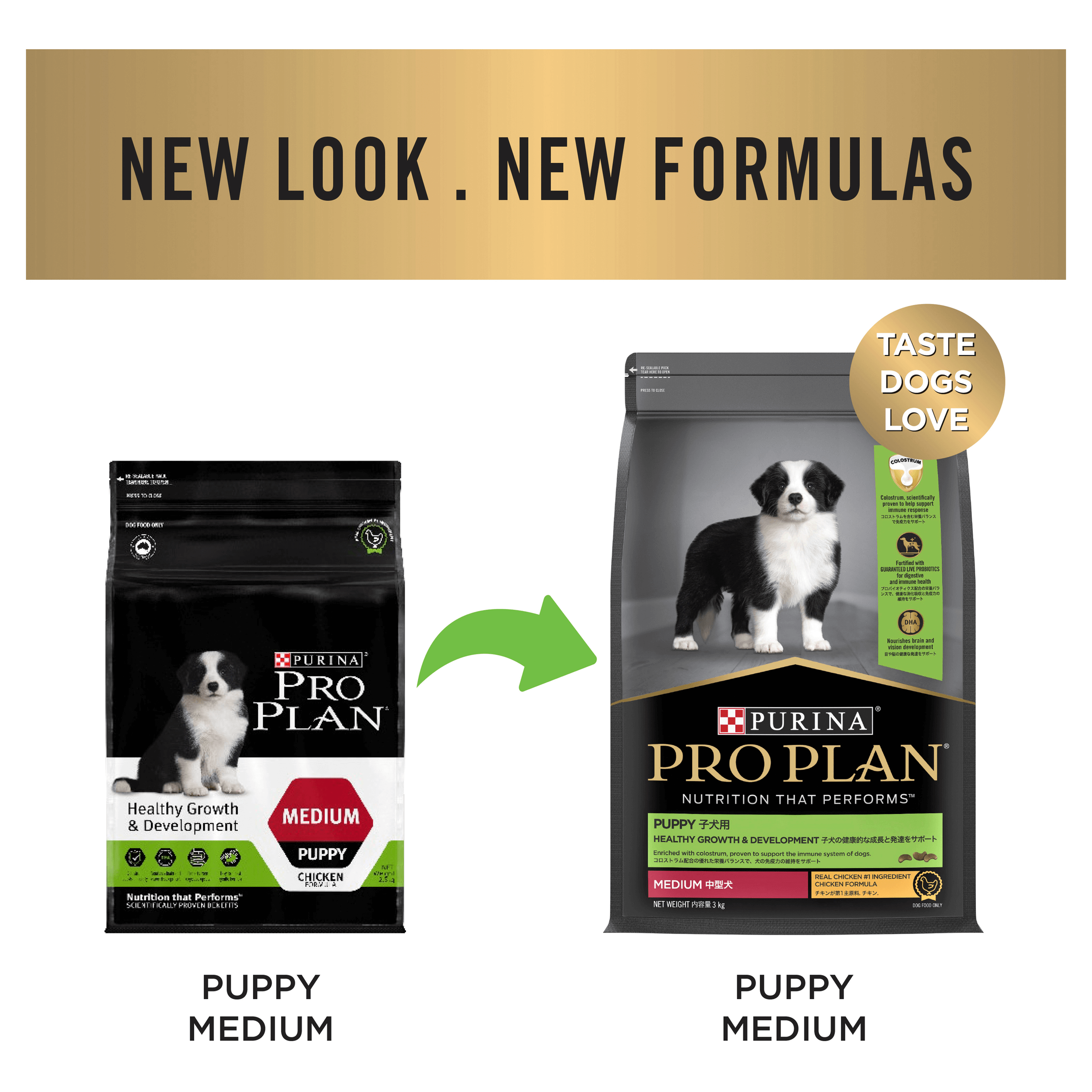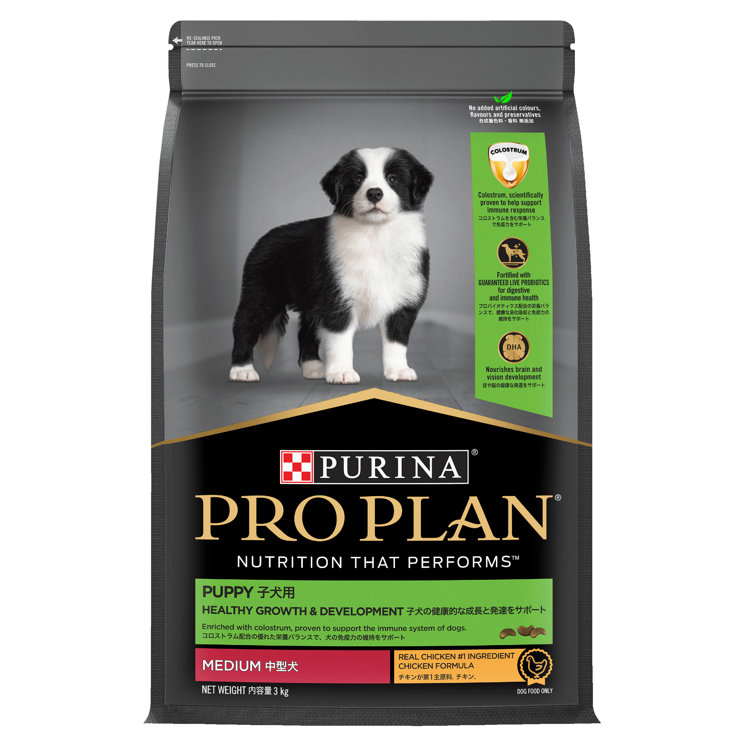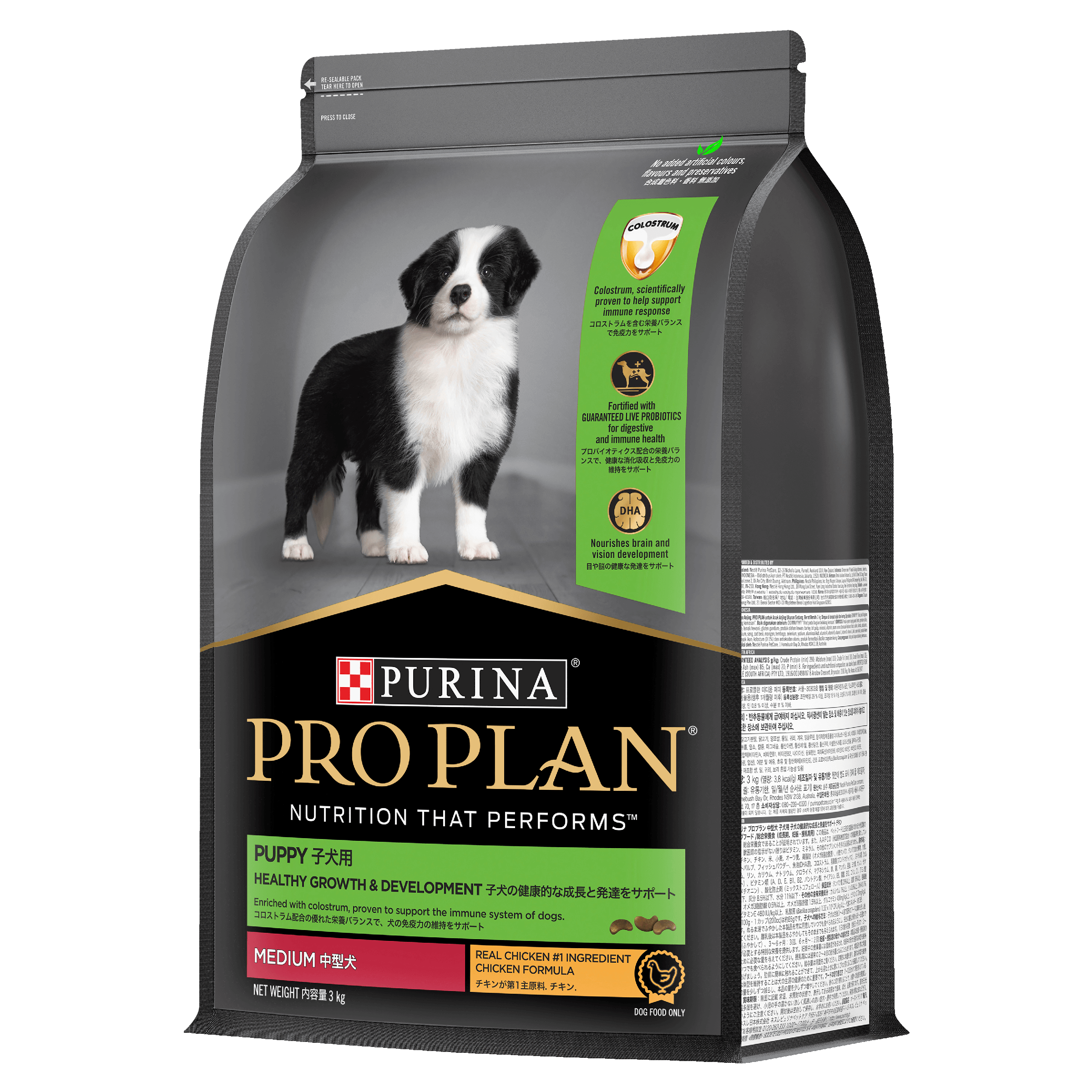 Prep your pup for a lifetime of vitality Proper nutrition, followed by the right care and cuddles, will help nurture your pup’s health and well-being. PRO PLAN® Healthy Growth and Development puppy food features a unique combination of live Probiotics and Colostrum. These innovative ingredients support the development of your puppy’s immature digestive and immune systems. Omega-6 fatty acids nourish that gorgeous new skin and fluffy coat. And a blend of other essential nutrients come together to help your pup thrive. DHA helps developing brains and eyes, while Calcium and Phosphorus help build strong bones and teeth. Fuel their lifetime of health and happiness with this premium puppy formula, tailor-made for their first year.