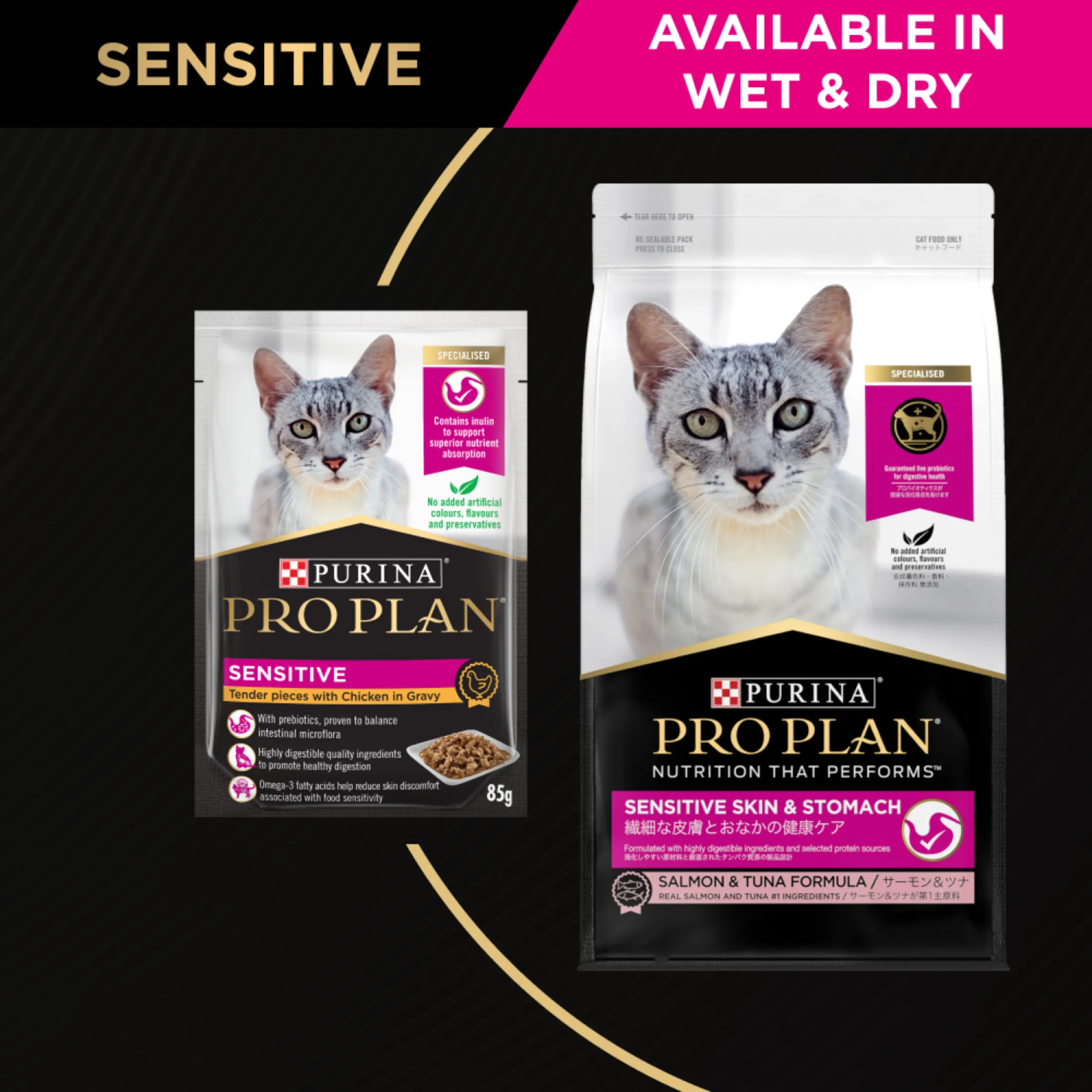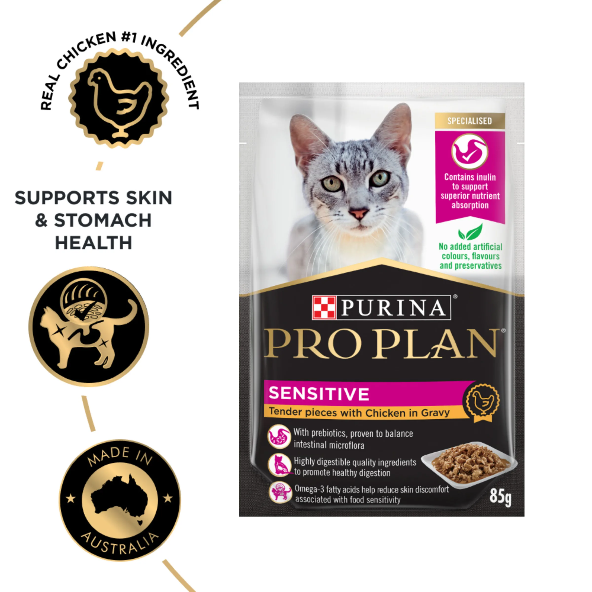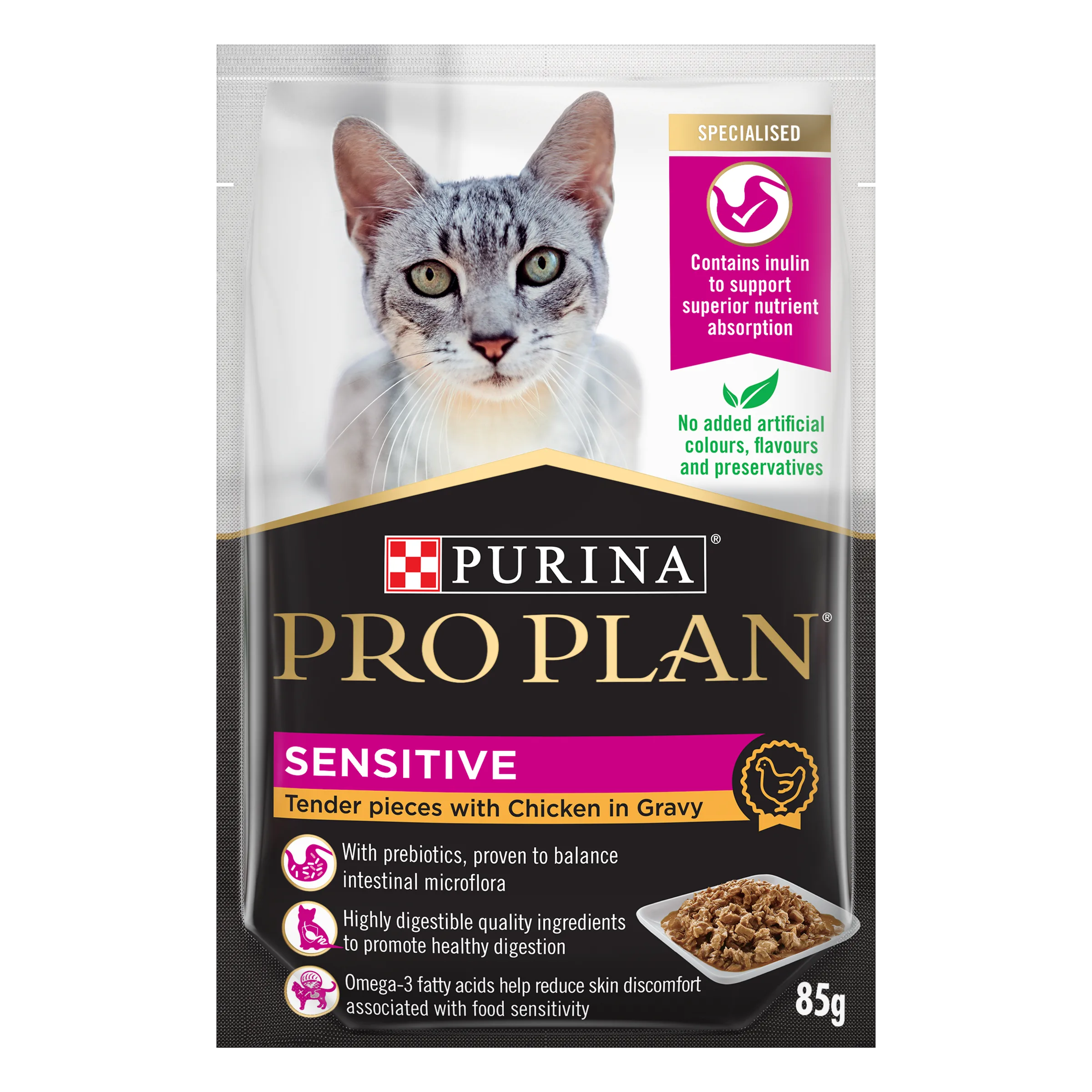 Pro Plan Sensitive wet cat food is scientifically formulated to be 100% complete and balanced, containing all of the essential nutrition your  adult cat needs, including a highly digestible quality ingredients to promote healthy digestion and a prebiotic, proven to balance intestinal microflora. It is made with real Chicken in a tasty gravy for a delicious flavour your cat will love.