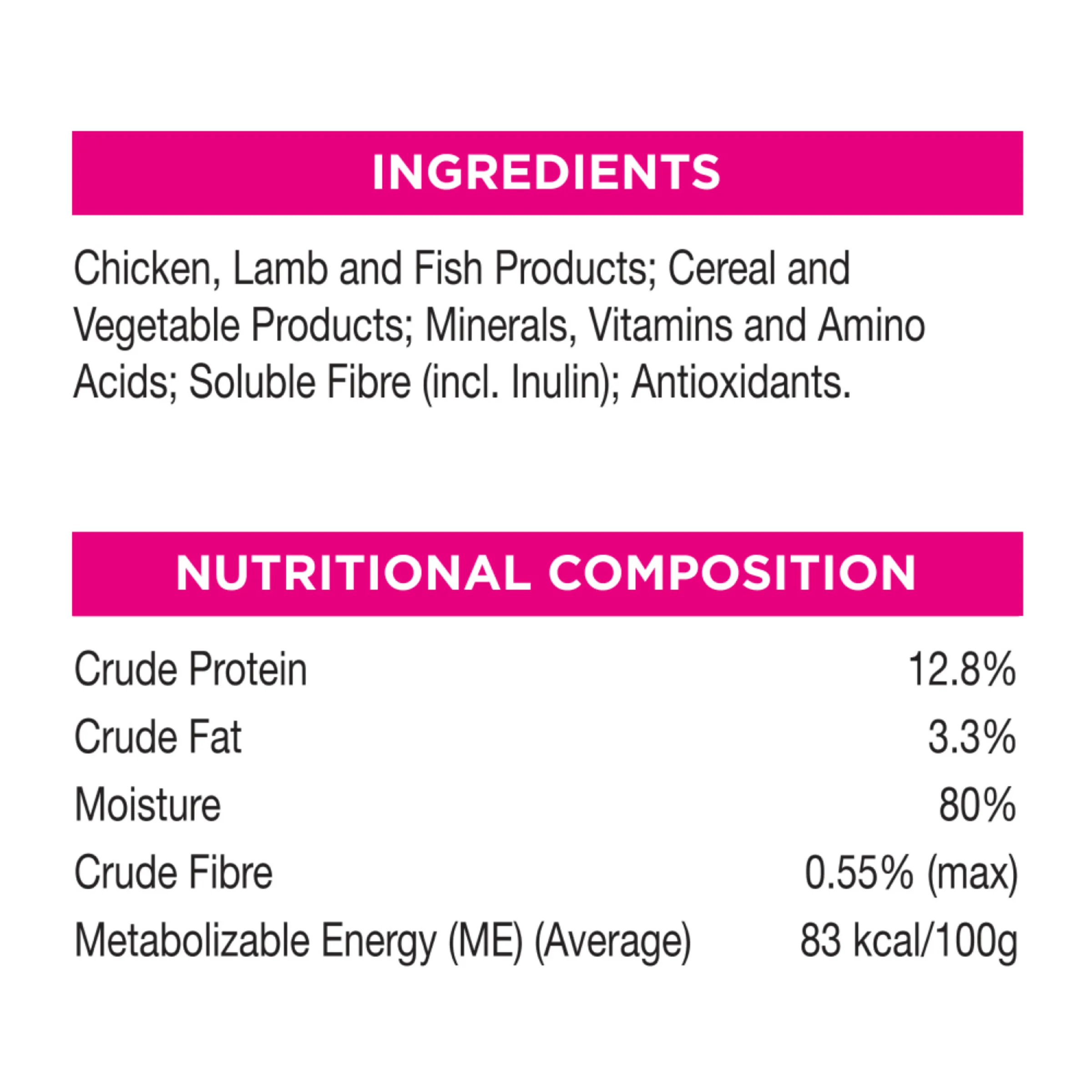 Crude Protein 12.8% (Typical) Crude Fat 3.3% (Typical) Moisture 80% (Max) Crude Fibre 0.5% (Typical) Calcium (Ca) 0.3% (Min) Phosphorus (P) 0.2% (Min) Metabolizable Energy (ME) 83kcal/100g