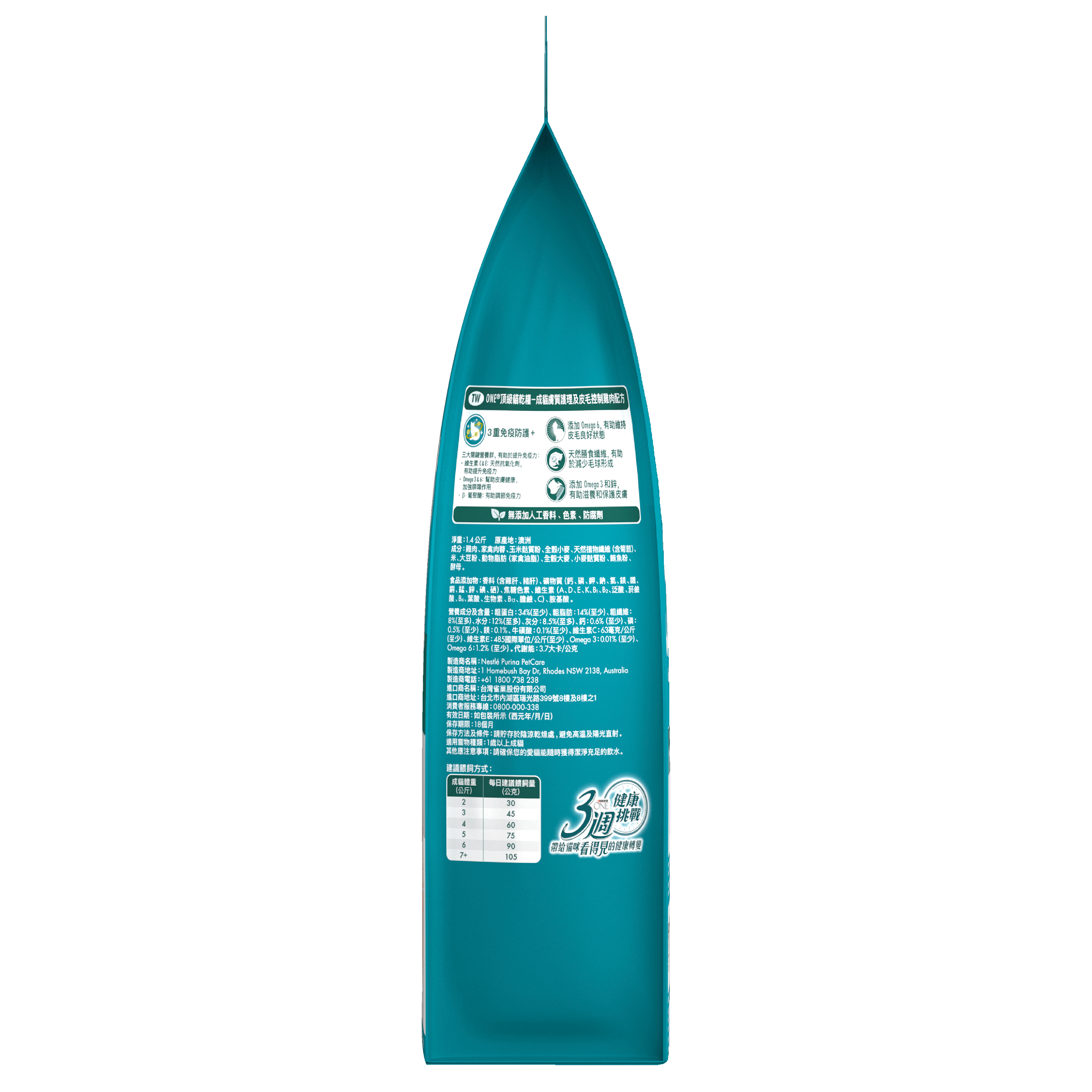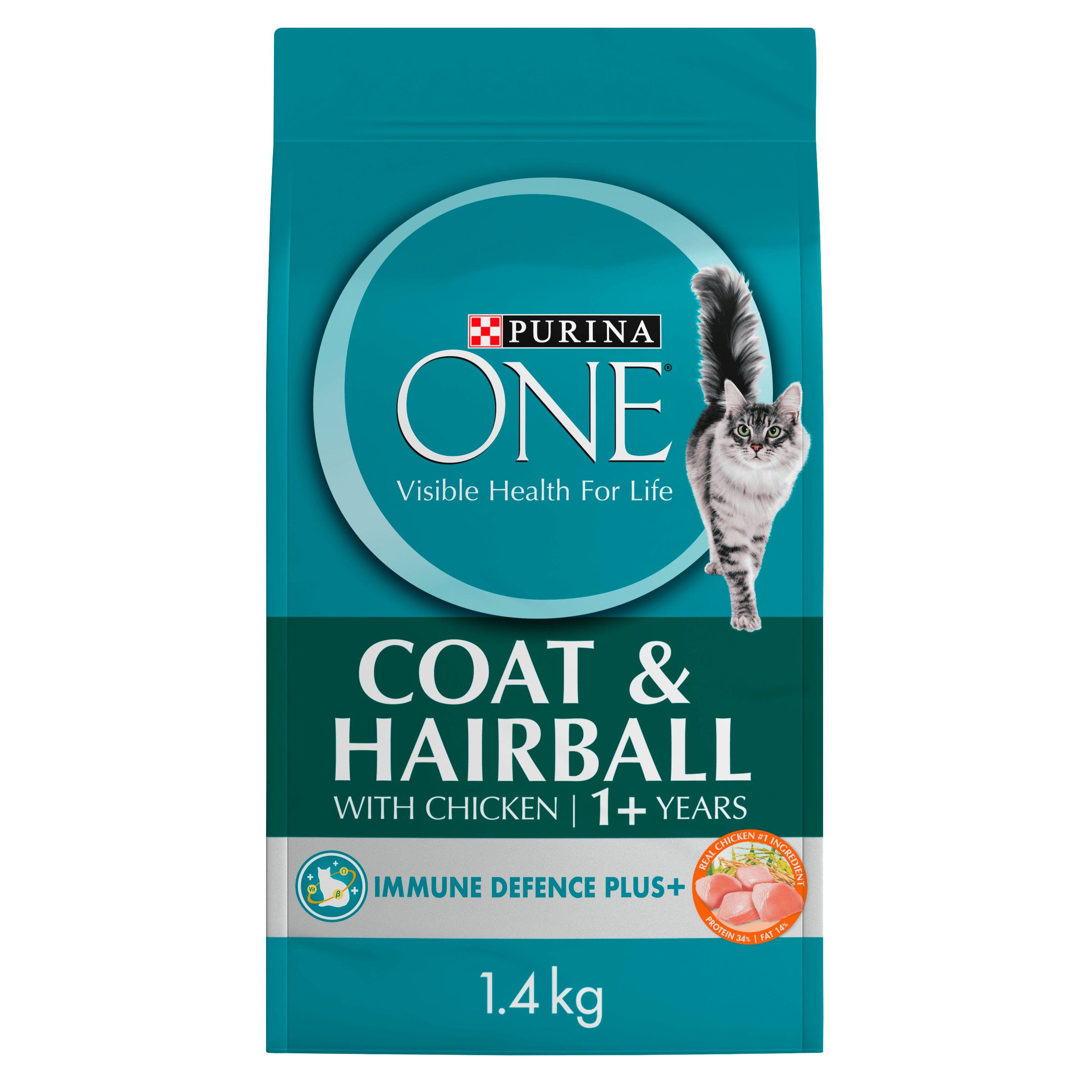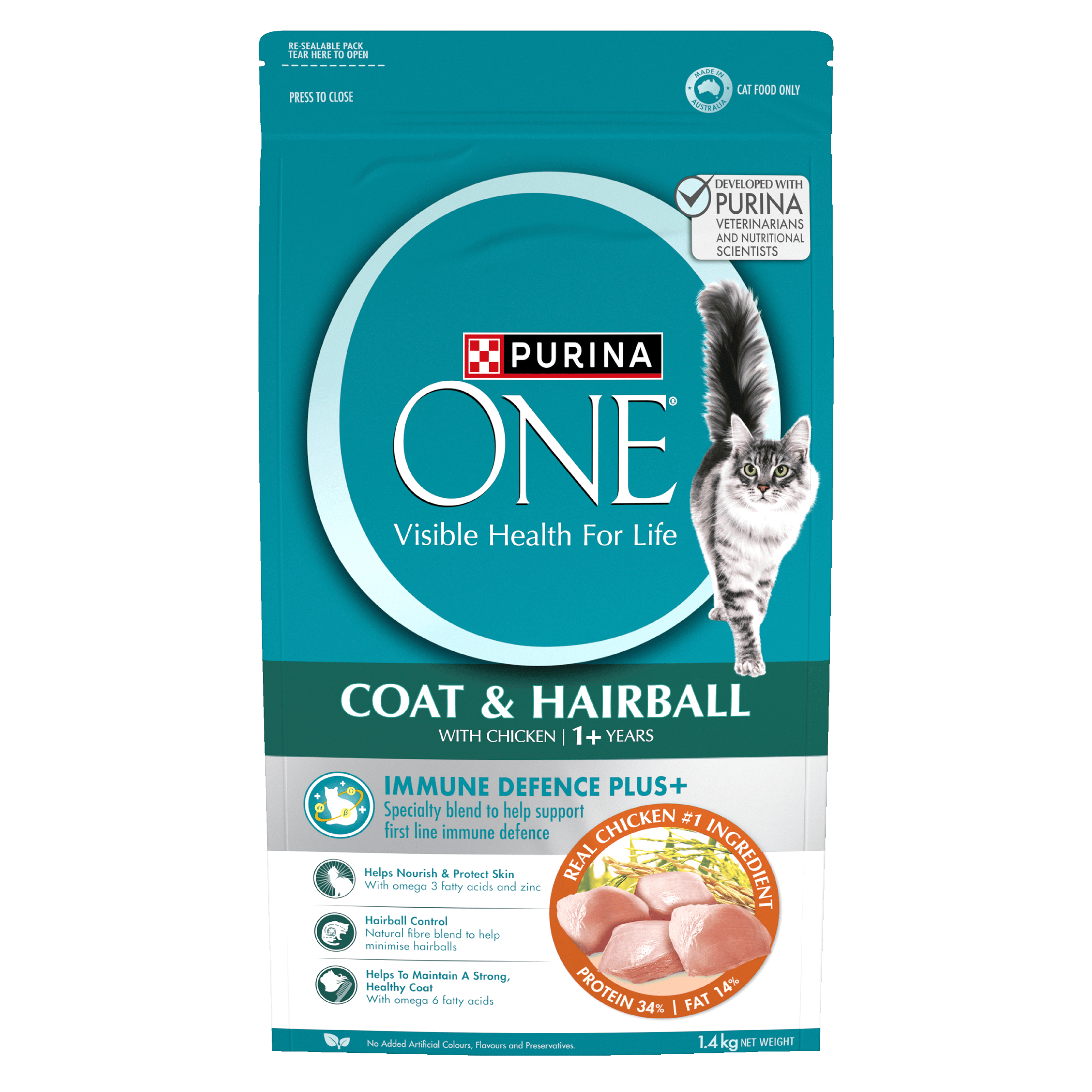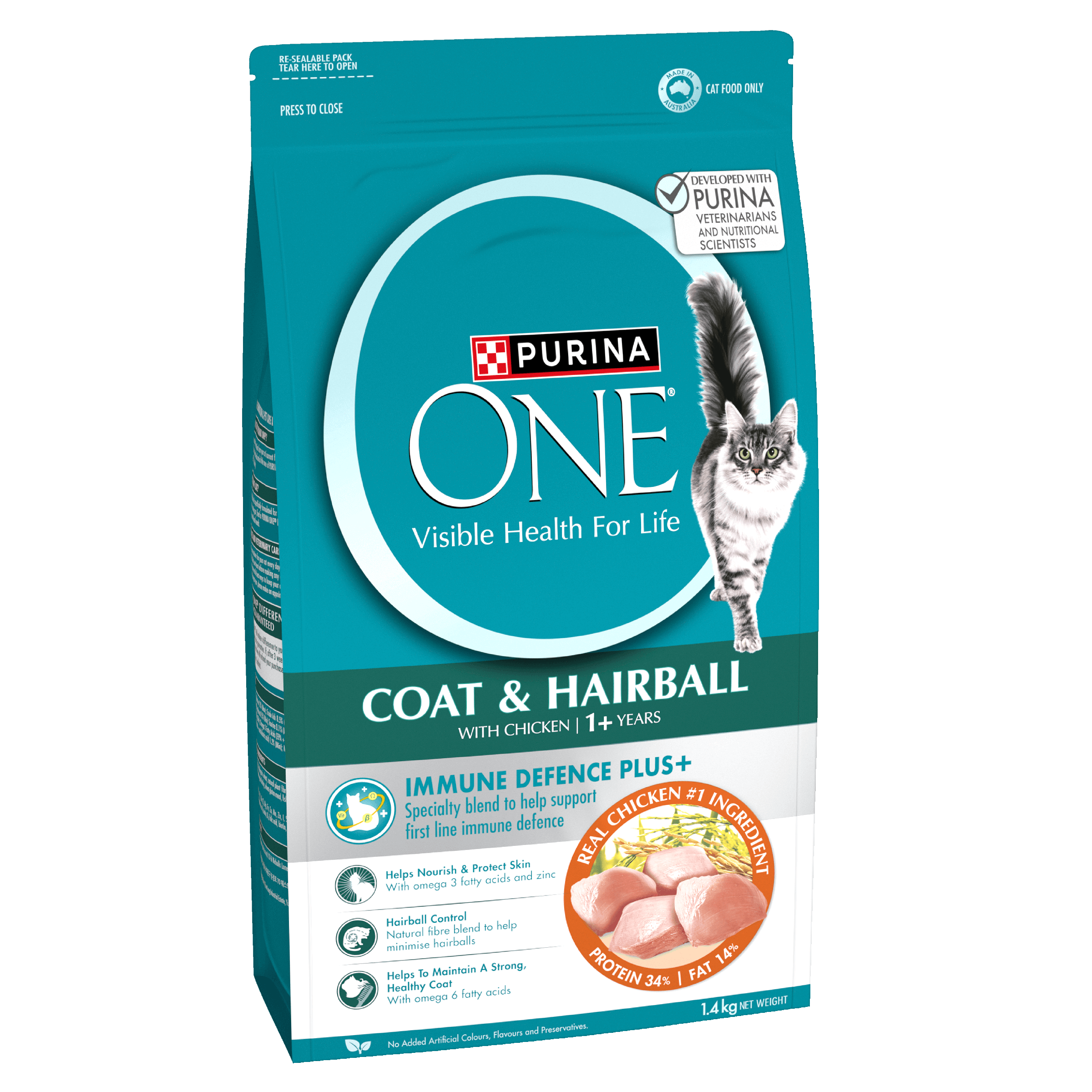 PURINA ONE® Coat & Hairball with IMMUNE DEFENCE PLUS+ has been specially formulated with beta glucans, vitamin C & E and omega 3 & 6 fatty acids. Working in parallel this blend helps support first line immune defence for your cat.