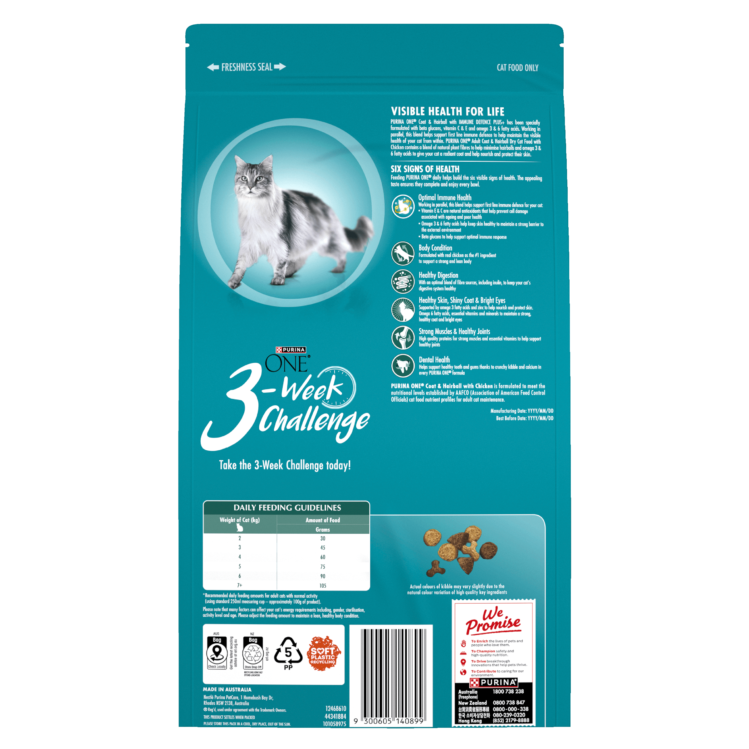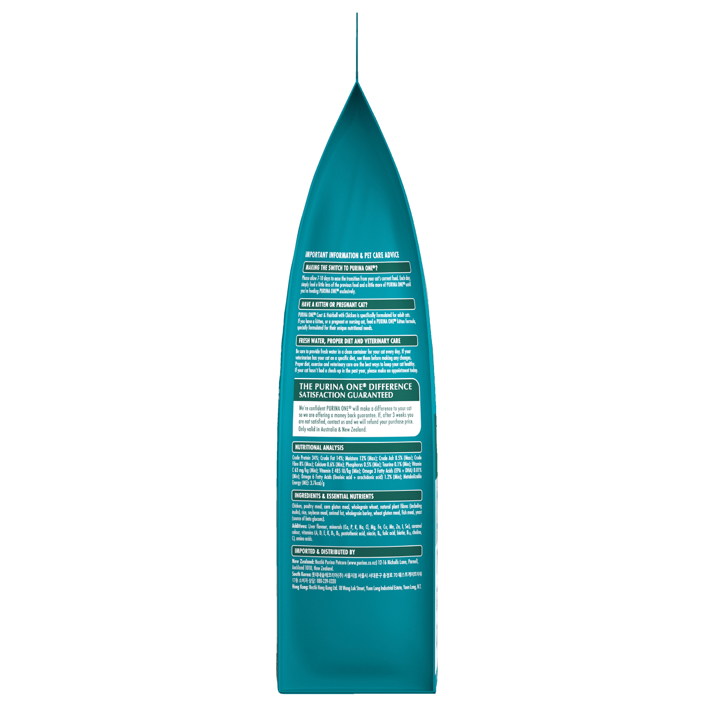 PURINA ONE® Adult Coat & Hairball Dry Cat Food with Chicken contains a blend of natural plant fibres to help minimise hairballs and omega 3 & 6 fatty acids to give your cat a radiant coat and help nourish and protect their skin.