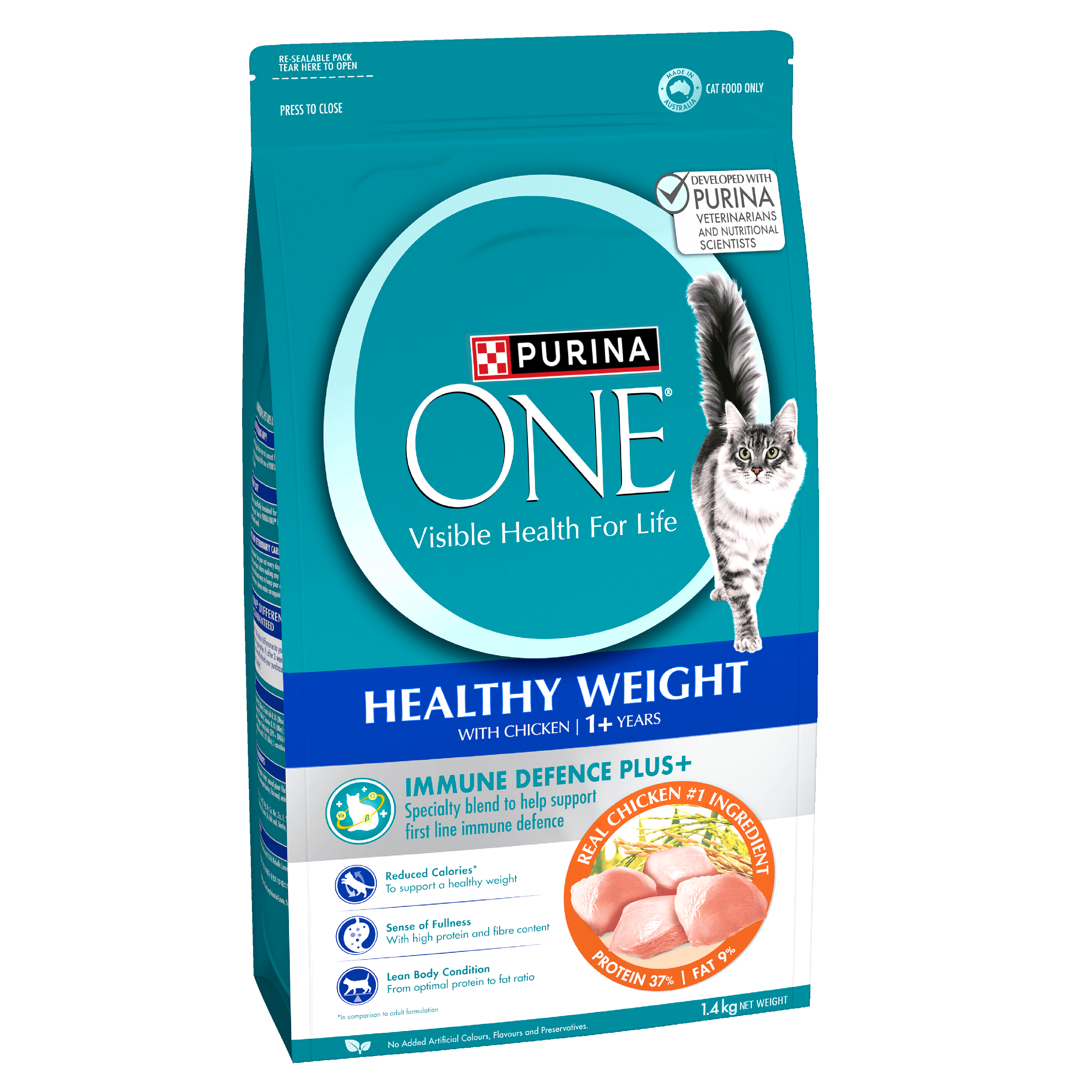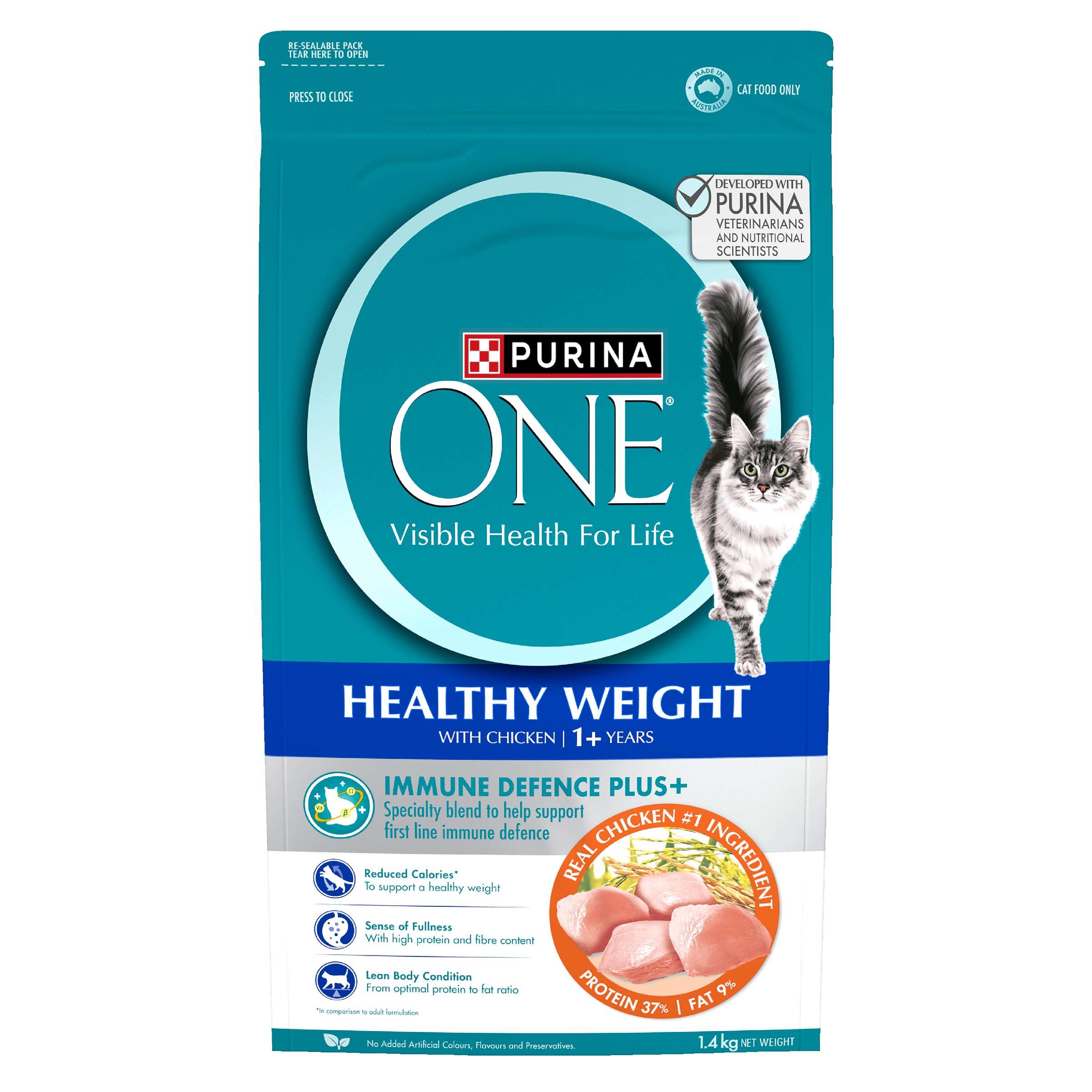 PURINA ONE® Healthy Weight with IMMUNE DEFENCE PLUS+ has been specially formulated with beta glucans, vitamin C & E and omega 3 & 6 fatty acids. Working in parallel this blend helps support first line immune defence for your cat.