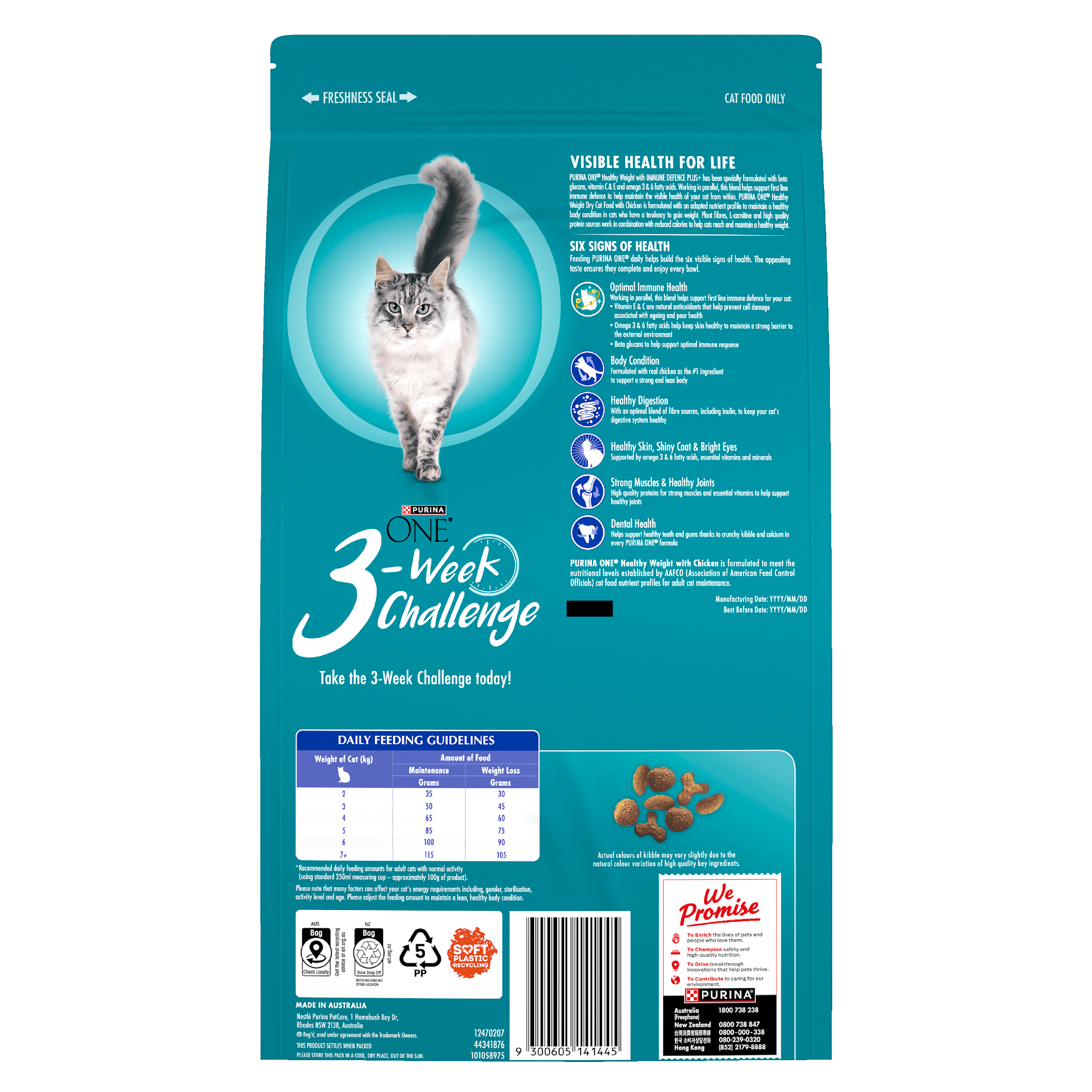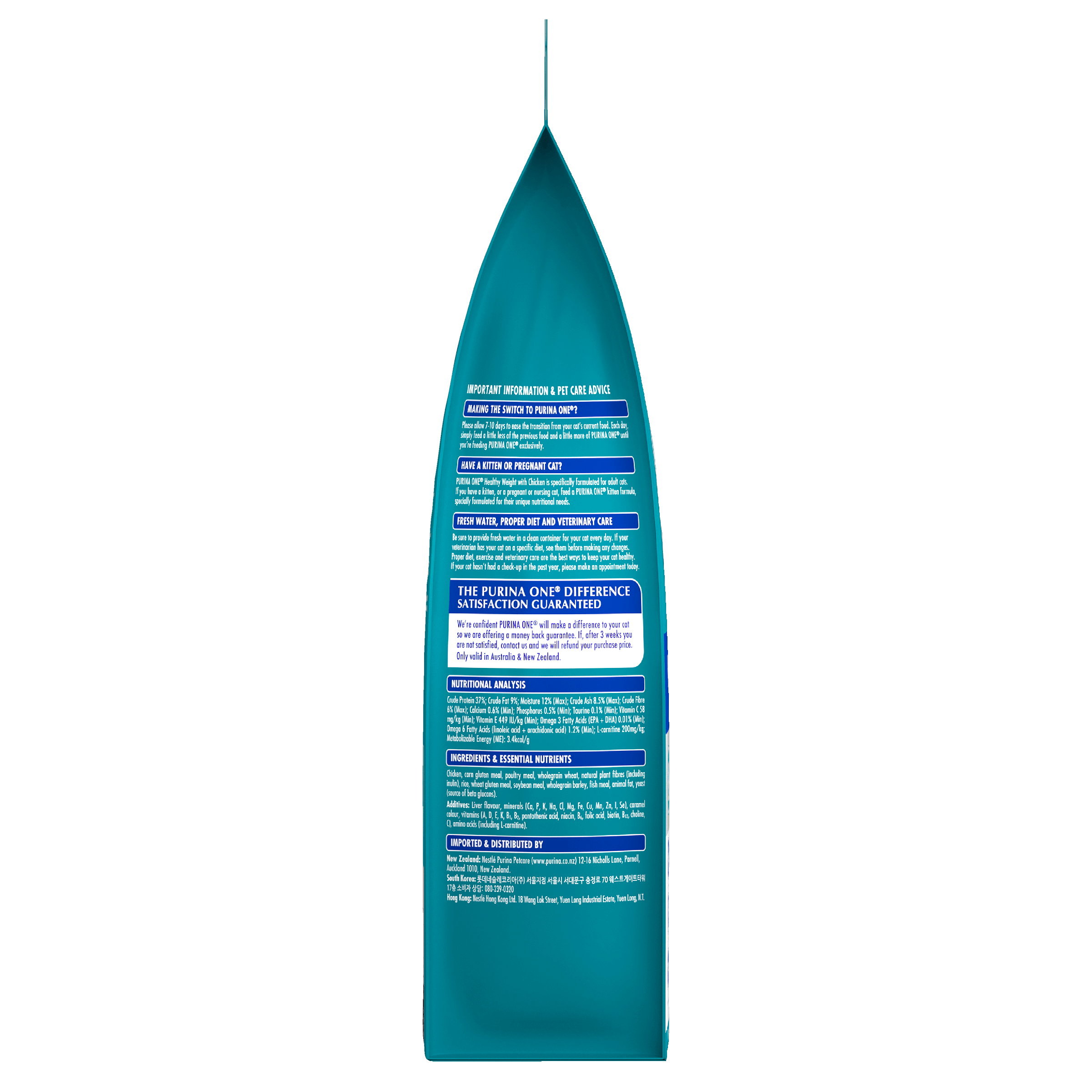 PURINA ONE® Healthy Weight Dry Cat Food with Chicken is formulated with adapted nutrient profile to maintain healthy body condition in cats who have a tendency to gain weight. Plant fibres, L-carnitine and high quality protein sources work in combination with reduced calories to help cats reach and maintain healthy weight.