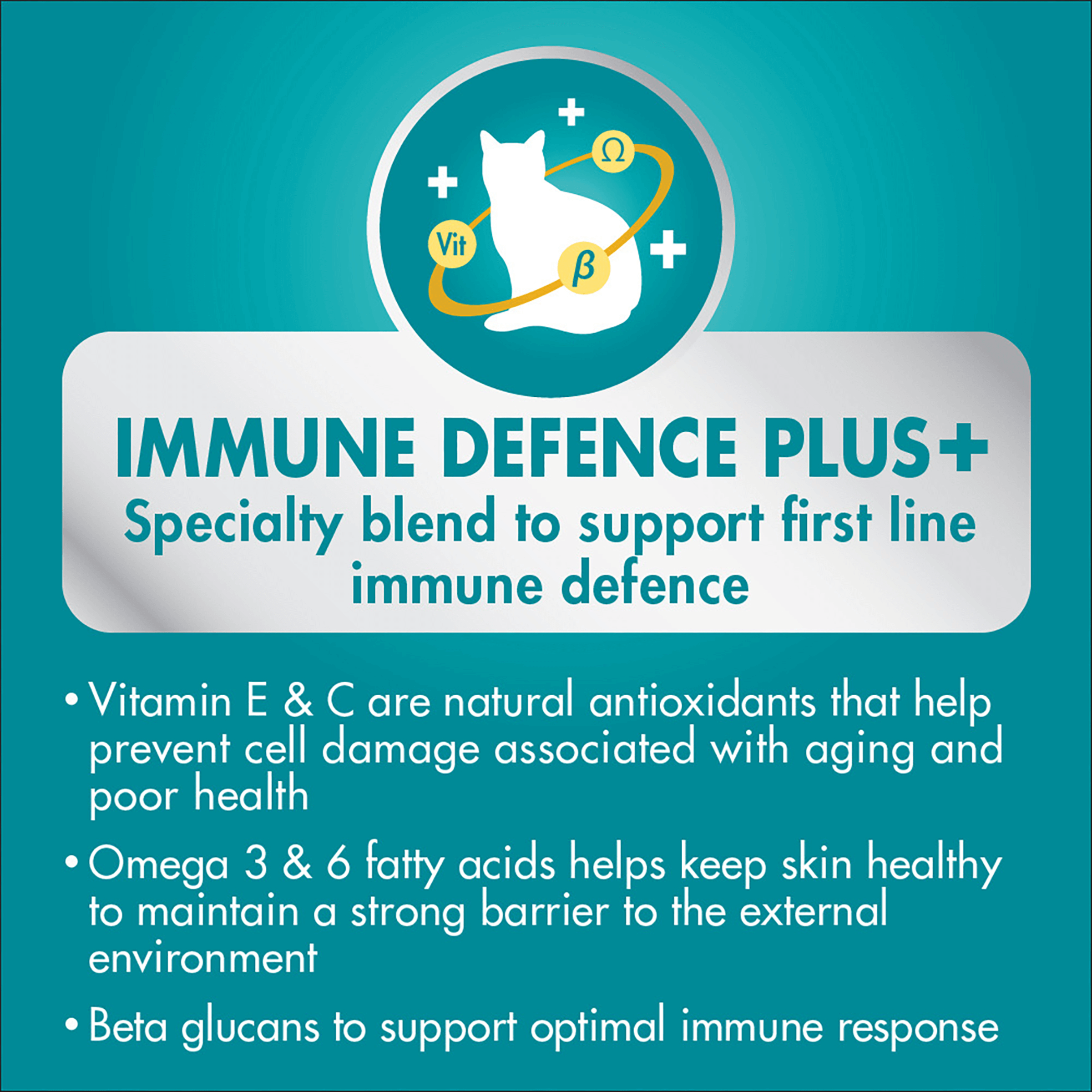 PURINA ONE® Urinary Care with IMMUNE DEFENCE PLUS+ has been specially formulated with beta glucans, vitamin C & E and omega 3 & 6 fatty acids. Working in parallel this blend helps support first line immune defence for your cat: