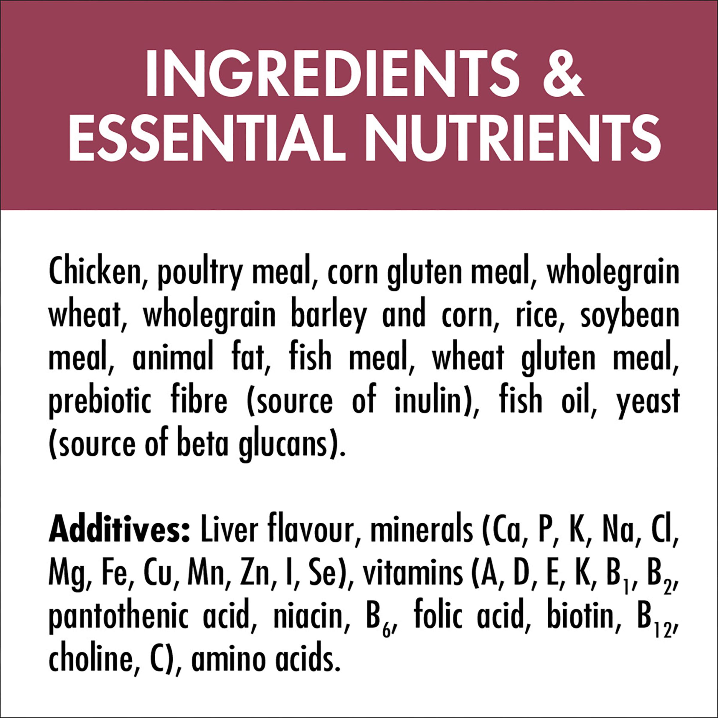 Chicken, poultry meal, corn gluten meal, wholegrain wheat, wholegrain barley and corn, rice, soybean meal, animal fat, fish meal, wheat gluten meal, prebiotic fibre (source of inulin), fish oil, yeast (source of beta glucans).