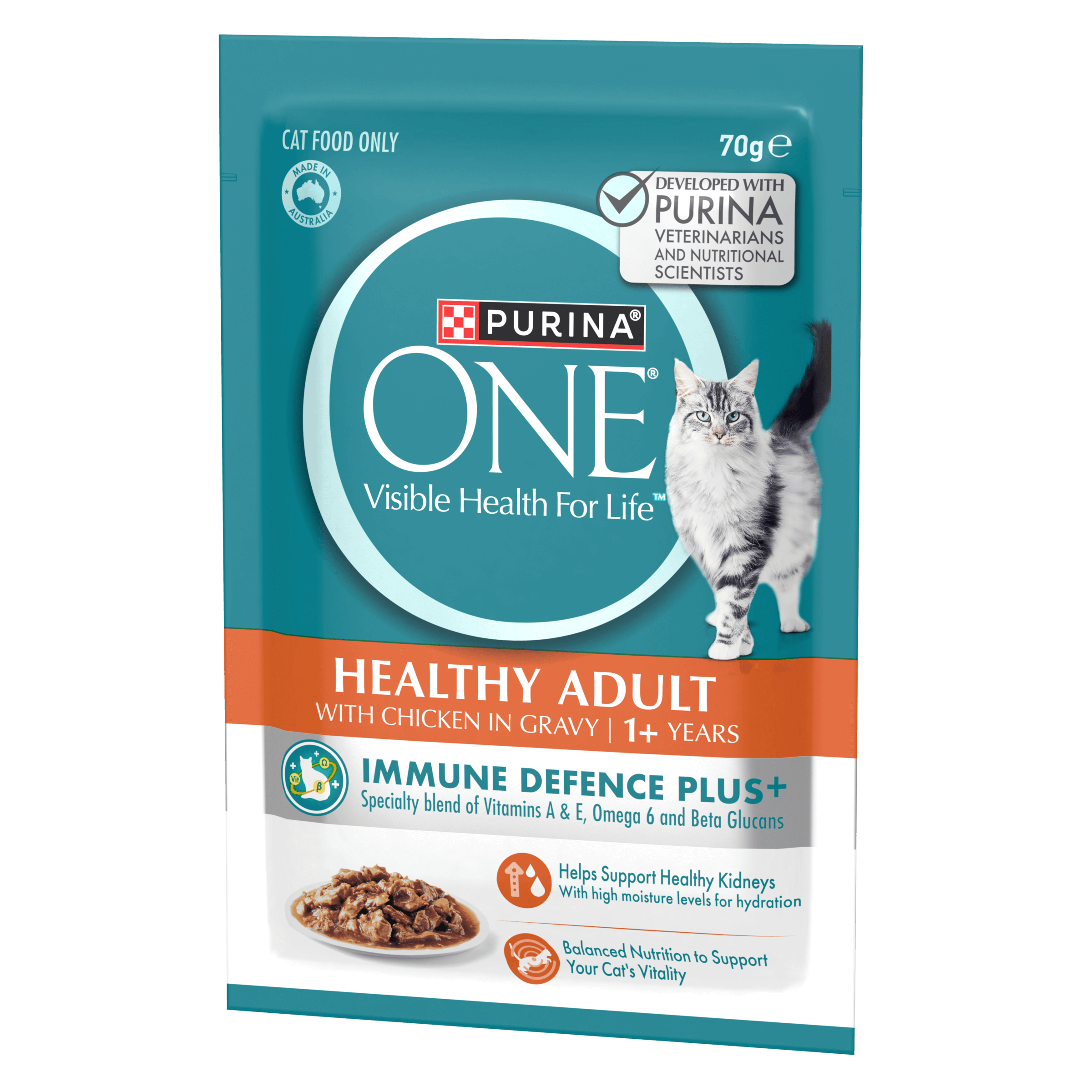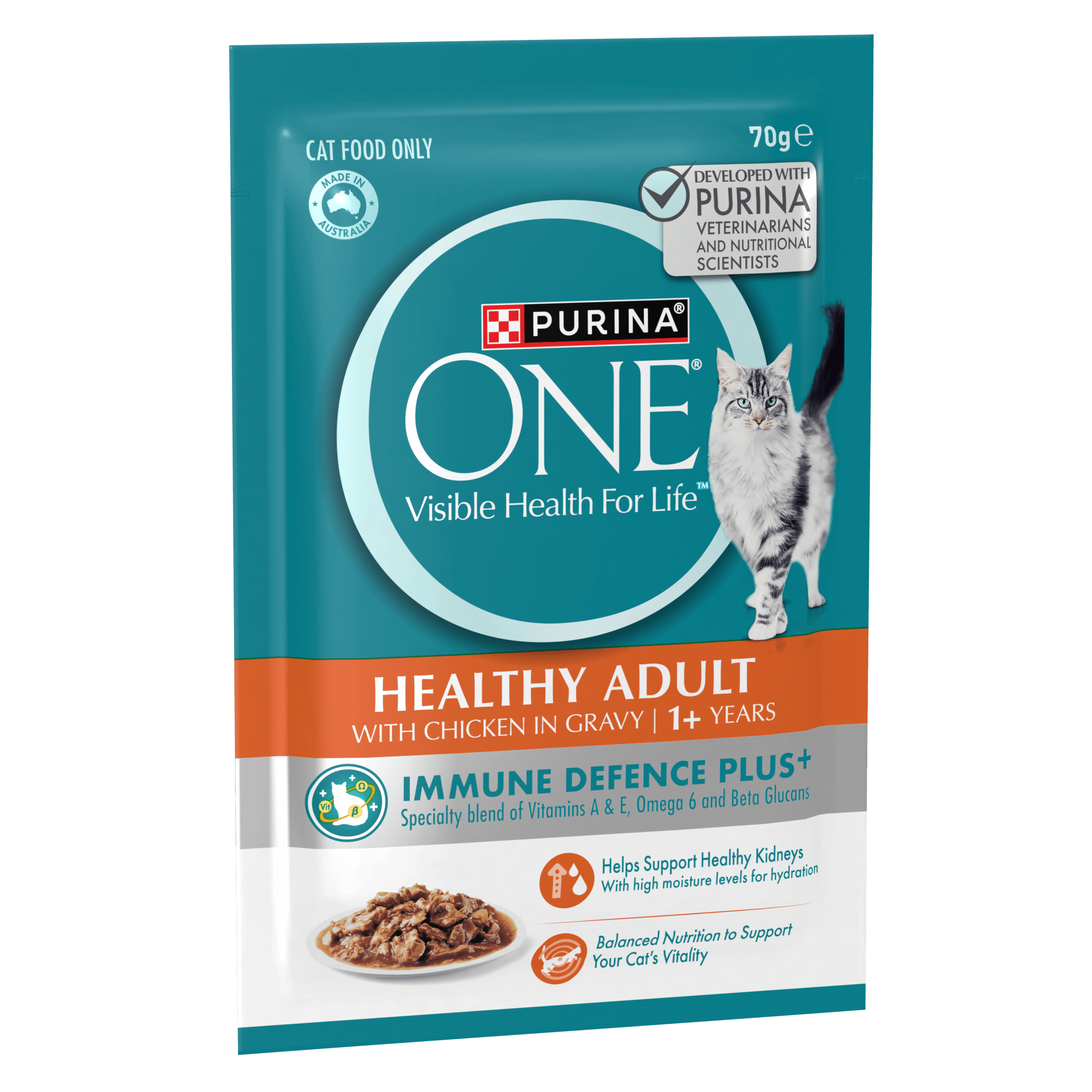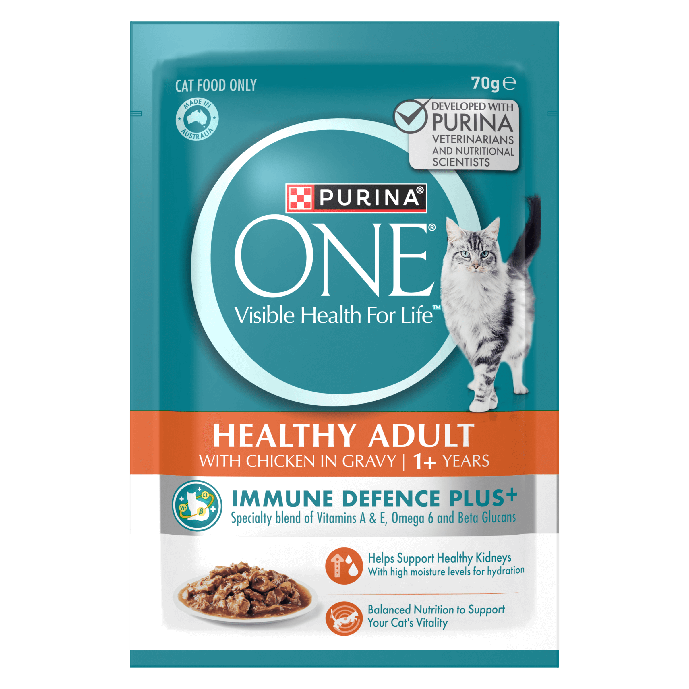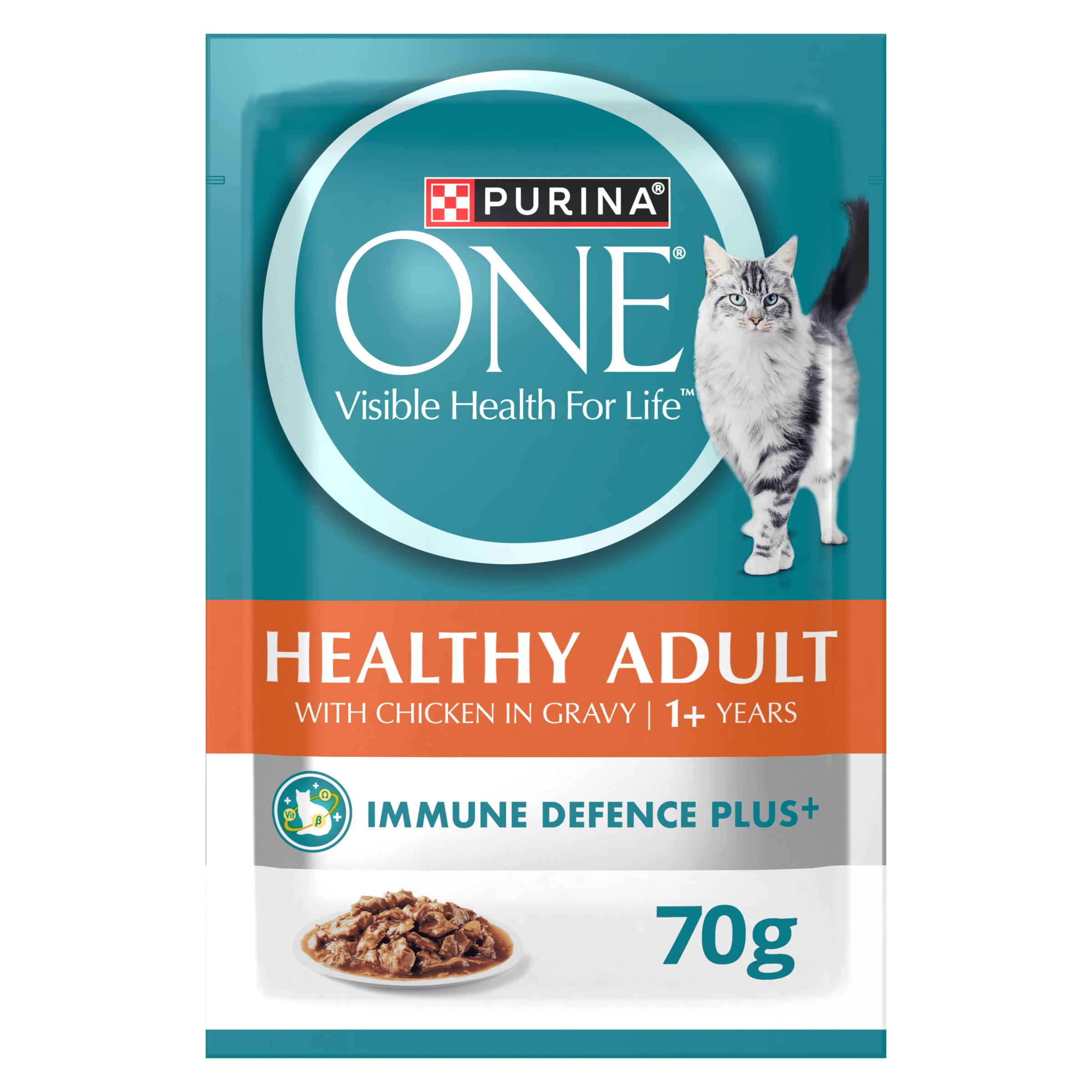 PURINA ONE® Healthy Adult Wet with Chicken now is formulated with Immune Defence Plus+, a special blend of Vitamins A & E, Omega 6 and Beta Glucans to help support your cat’s natural defences from the inside out.