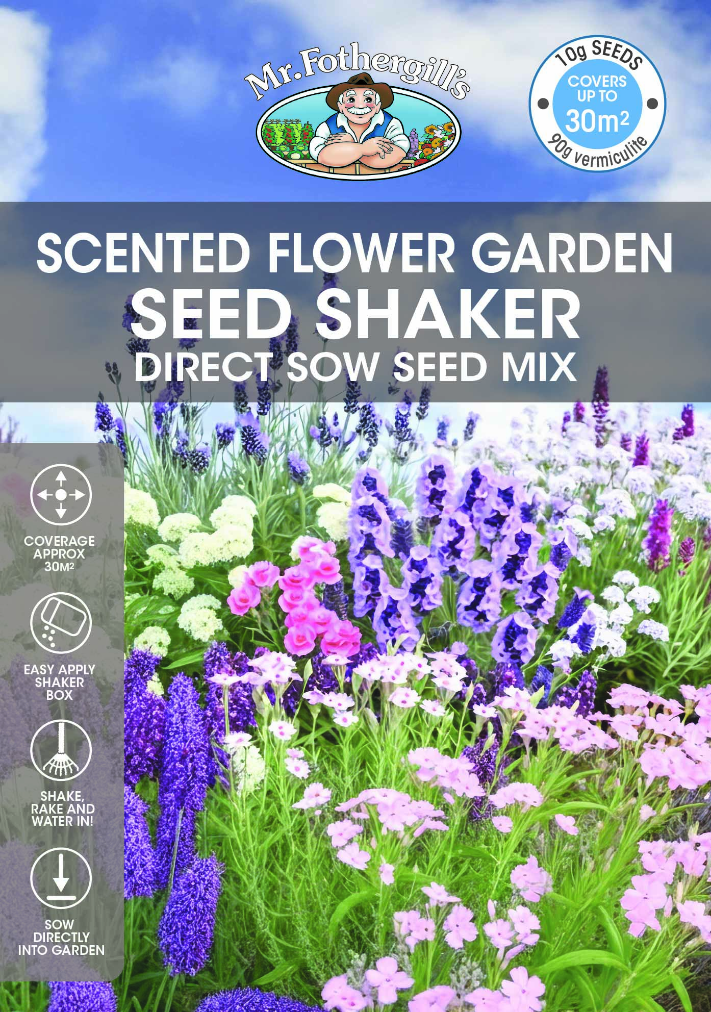 This Scented Flower Garden Seed Shaker contains 100g of Shake & Rake mix (10g seed and 90g vermiculite), enough to cover a 30m² area. The seed mix contains vermiculite, a natural mineral that ensures even seed distribution, maintains moisture levels, and supports optimal germination.