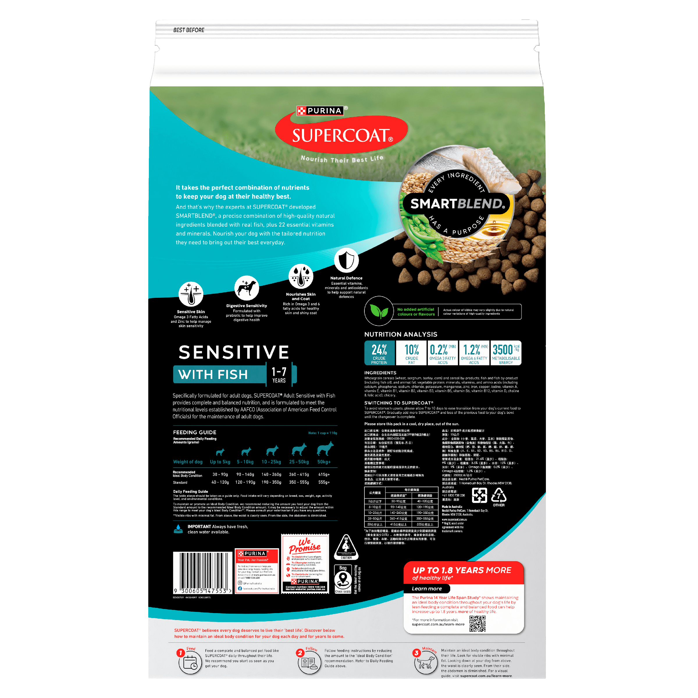 Whether your dog is a small breed or a large one, SUPERCOAT® SMARTBLEND® – Adult Sensitive Dog Food with Fish is suitable for dogs of all sizes and breeds. With different bag sizes available, you can choose the perfect fit for your furry friend’s needs.
