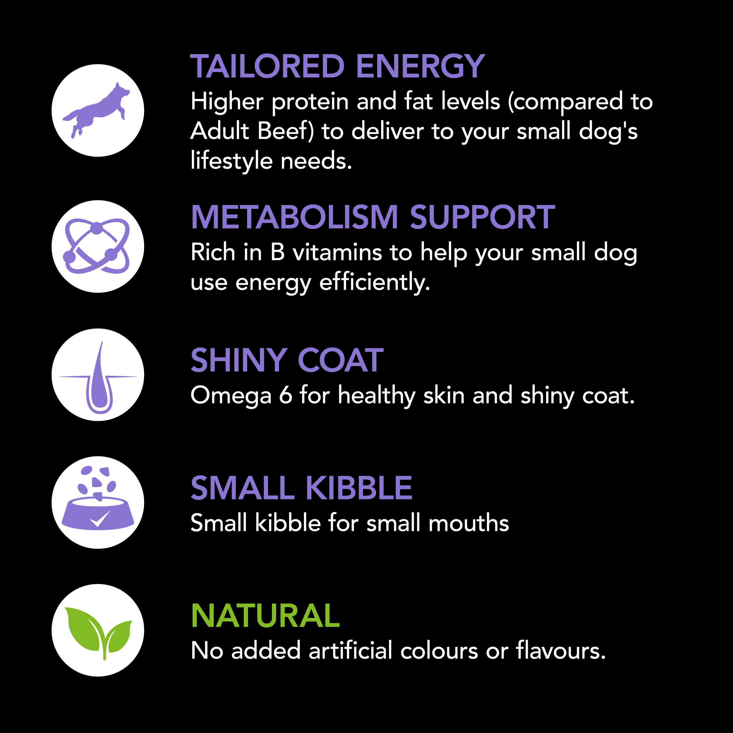 - Metabolism Support – Supporting small dogs’ faster metabolism with high levels of protein and fat