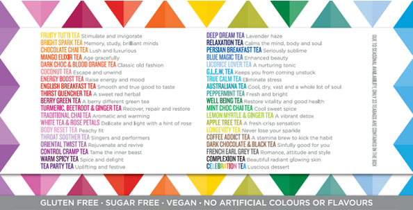 Please note, the flavours can’t be changed or substituted. There are 42 teas in our range but only 33 teas included due to seasonal availability. If there is one you definitely want to try, please email us and we will do our best to accomodate your request.