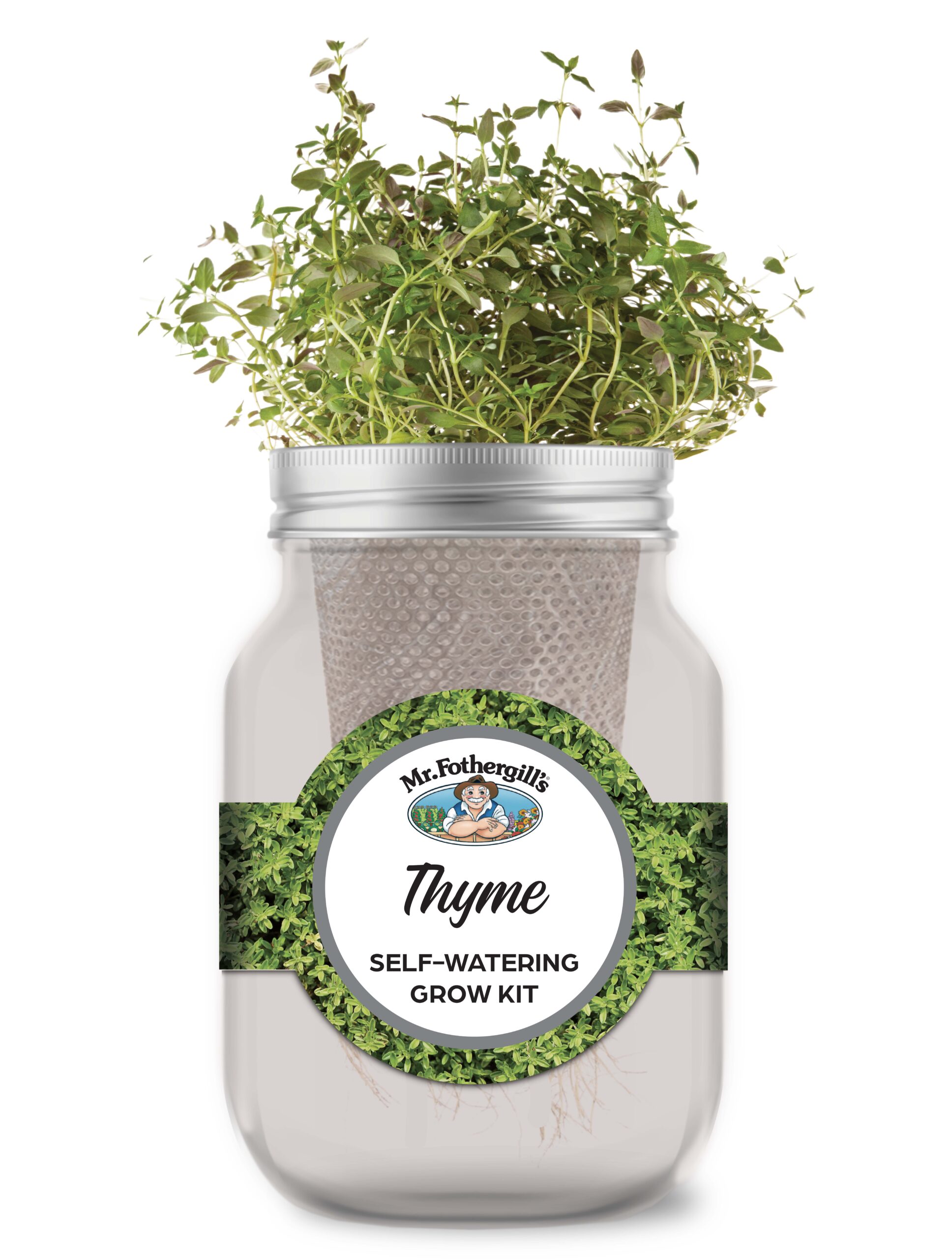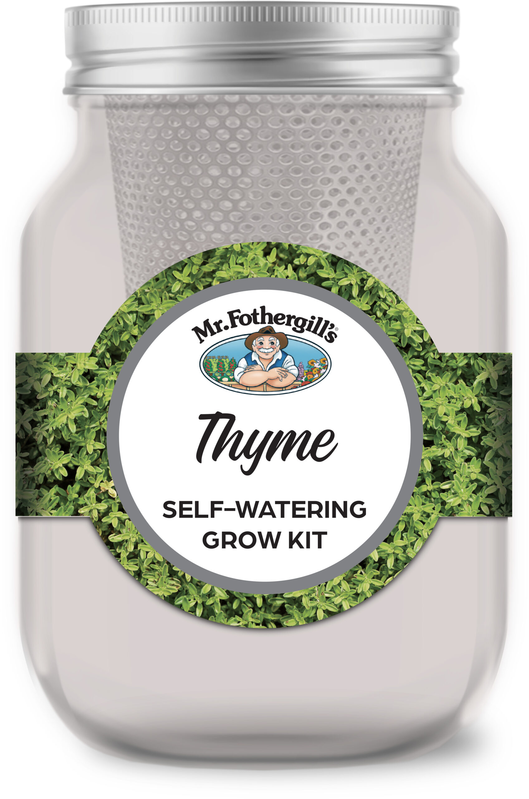 Each kit includes 1x grey mason jar, 1x seed sachet (Thyme), 1x soil pellet, 1x metal basket with wick, and growing instructions.