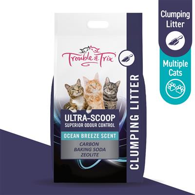 Trouble and Trix Ultra-Scoop litter is the ultimate odour solution for households with multiple cats, or for optimum odour control in general. This triple-action formula combines three powerful, odour-fighting ingredients, carbon, baking soda and zeolite. Carbon is highly absorbent and traps the odour, baking soda neutralises acidic urine and zeolite absorbs the liquid and odour. This premium litter forms scoopable clumps for convenient cleaning and reduced wastage and has a fresh and light ‘ocean breeze’ fragrance.